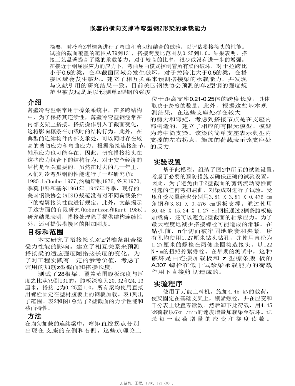 嵌套的横向支撑冷弯型钢Z形梁的承载能力外文翻译资料 2023-01-20 09:30:51 英语原文共 4 页,剩余内容已隐藏,支付完成后下载完整资料 英语译文共 4 页,剩余内容已隐藏,支付完成后下载完整资料 资料编号:[254621],资料为PDF文档或Word文档,PDF文档可免费转换为Word 您需要先支付 30元 才能查看全部内容!立即支付 发小红书推广免费获取该资料资格。点击链接进入获取推广文案即可: Ai一键组稿 | 降AI率 | 降重复率 | 论文一键排版 PREVIOUS NEXT 您可能感兴趣的文章 南昌市湖滨花园宅楼设计文献综述 大跨空间网架结构金属屋面板的风致疲劳损伤研究文献综述 螺栓连接装配式混凝土框架结构承载力研究及应用文献综述 天山区财政局办公综合楼设计文献综述 超高结构风效应的风洞试验研究开题报告 武汉市太子湖中学图书馆设计开题报告 仁新高速(40 43)m钢-混组合连续梁桥力学性能分析文献综述 青岛赫谷农牧公司钢结构办公楼设计开题报告 中望置业有限责任公司综合楼设计开题报告 3×25m预应力混凝土箱梁桥施工图设计开题报告