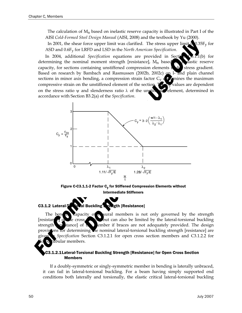 美国钢结构学会冷弯型钢设计手册(美国钢结构学会2008)和余教授编写的教科书(2000)的第一部分说明了关于非弹性储备能力的Mn的计算。在2001,已经清楚了剪力上限值。在北美规范中,对于ASD其应力上限值是0.35fy,而对于LRFD和LSD则是0.6fy。在2004年,在C3.1.1(b)部分中又增加了规范方程,可用来确定在应力梯度下对于非压缩杆件的非弹性储备能力的力矩值的Mn。在本巴赫和拉斯姆森(2002b,2002C)在对短轴弯曲中的I型钢和普通槽钢的研究中,压缩应变系数Cy决定了刚性元件的最大压缩应变值。而Cy取决于刚性元件的应力比和长细比,与规范B部分3.2(a)的说明相一致。