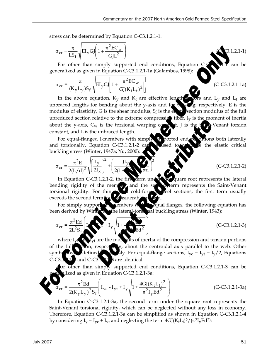 如果一个双对称或单轴对称的受弯构件是受到横向支撑的话,它会由于侧扭屈曲而破坏。对于一个受到横向和扭转的简支端梁,其弹性弯扭屈曲临界应力可以通过方程C-C3.1.2.1-1确定。
