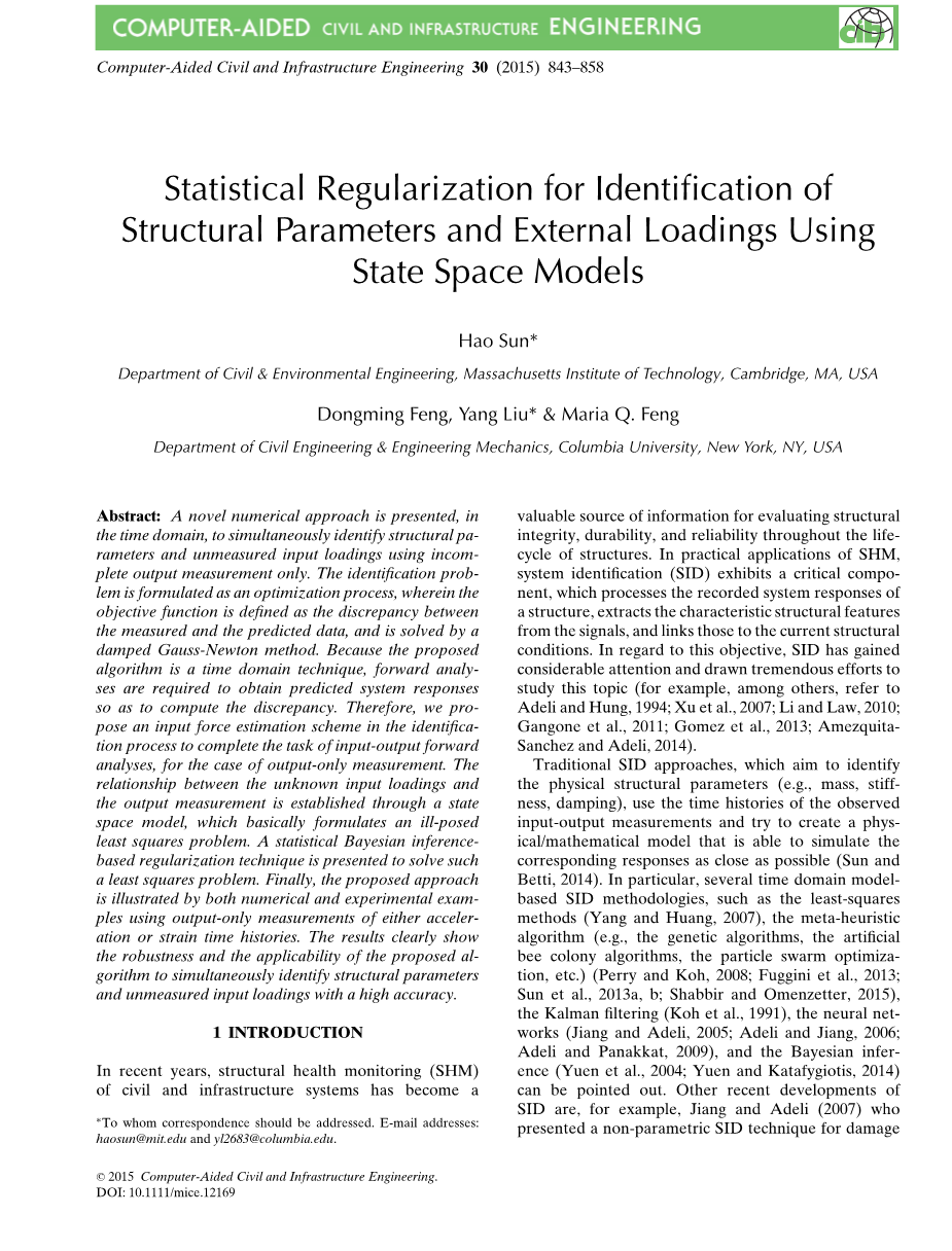 近年来,结构卫生监测(SHM)民用和基础设施系统已成为一种评估结构的整个生命周期的完整性、持久性和可靠性的重要信息来源。在SHM的实际应用中,系统识别(SID)展示了一个关键组件,记录系统响应的处理方式是什么结构,从信号中提取结构特征,并将它们与当前的结构联系起来。关于这个目标,SID已经吸引了大量的注意力,并作出了巨大的努力研究这个话题(例如,其他的,请参考Adeli and Hung, 1994; Xu et al., 2007; Li and Law, 2010;Gangone et al., 2011; Gomez et al., 2013; AmezquitaSanchezand Adeli, 2014)。