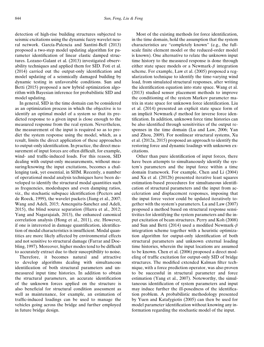 一般情况下,在时间域中可以考虑SID作为一个优化过程,目标是确定一个系统的最优模型,以便预测对给定输入的响应非常接近测量来自真实系统的响应。尽管如此,对输入的测量是必需的,以便预测使用模型的系统响应,作为一个结果,限制了这些方法的直接应用输出。在实践中,直接测量例如,输入力通常很困难,风和交通诱导载荷。出于这个原因,SID在不测量、不知道的情况下,处理输出数据,变成一个挑战,但是在SHM中,却是非常关键的。最近,很多已开发了操作模态分析技术识别结构模态的数量频率,模,甚至阻尼比,维兹,随机子空间识别(Peeters and de Roeck, 1999),the wavelet packets (Jiang et al., 2007;Wang and Adeli, 2015; Amezquita-Sanchez and Adeli,2015),“盲源分离” (Hazra et al., 2012;Yang and Nagarajaiah, 2013),《强化规范》相关分析(Hong et al., 2011)等。然而,如果有人对破坏数量感兴趣,那仅仅鉴定一下模态特征是不够的。模态数量更有可能受到环境影响而对结构损伤不敏感(Farrar and Doebling,1997)。此外,较高的模式往往是很困难达到精确地提取,因为它们容易产生噪音。