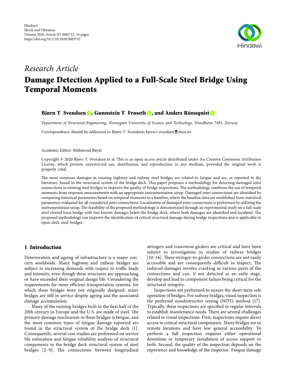 摘要地狱桥试验场地桥面结构体系中存在两种已知的节点损伤。这些损伤位于桥梁中间的一侧,这是在桥梁使用寿命的最初阶段进行的翻新。尽管进行了改造,但所有节点连接都具有相同的承载功能。在大桥运行期间的例行间隔检查中没有发现损坏。这些损伤最初是在桥退出使用前的一次测量活动中发现的,在那次测量中,只对选定的连接节点进行了应变测量。当桥梁在操作荷载作用下,其各自的主梁发生不必要的垂直运动,从而造成损伤。因此,其结果是严重降低了承载能力。