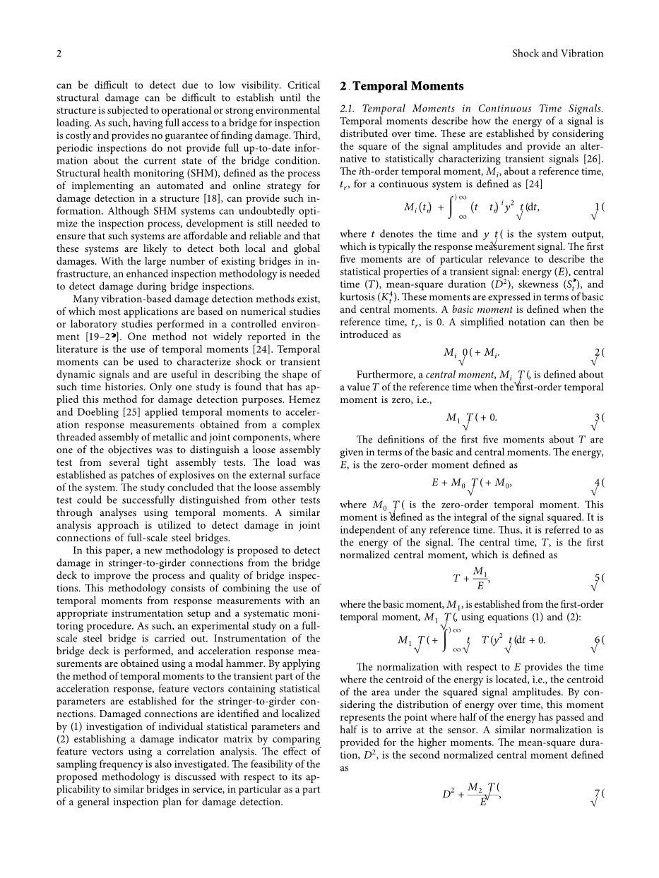 目前存在许多基于振动的损伤检测方法,其中大多数应用都是基于数值研究或在受控环境下进行的实验室研究[19-23]。在文献中没有广泛报道的一种方法是使用时间时刻[24]。时间力矩可以用来表征激波或瞬态动态信号,并且在描述这些时间历程的形状时很有用。只有一项研究发现将这种方法用于损伤检测目的。赫麦斯和多布林[25]将时间力矩应用于从金属和关节组件的复杂螺纹装配中获得的加速度响应测量,其中一个目标是区分松散装配测试和紧密装配测试。载荷被设定为系统外表面的炸药块。研究的结论是,松散装配试验可以通过分析时间力矩成功地区别于其他试验。一个类似的分析方法被用来检测全尺寸钢桥的连接损伤。