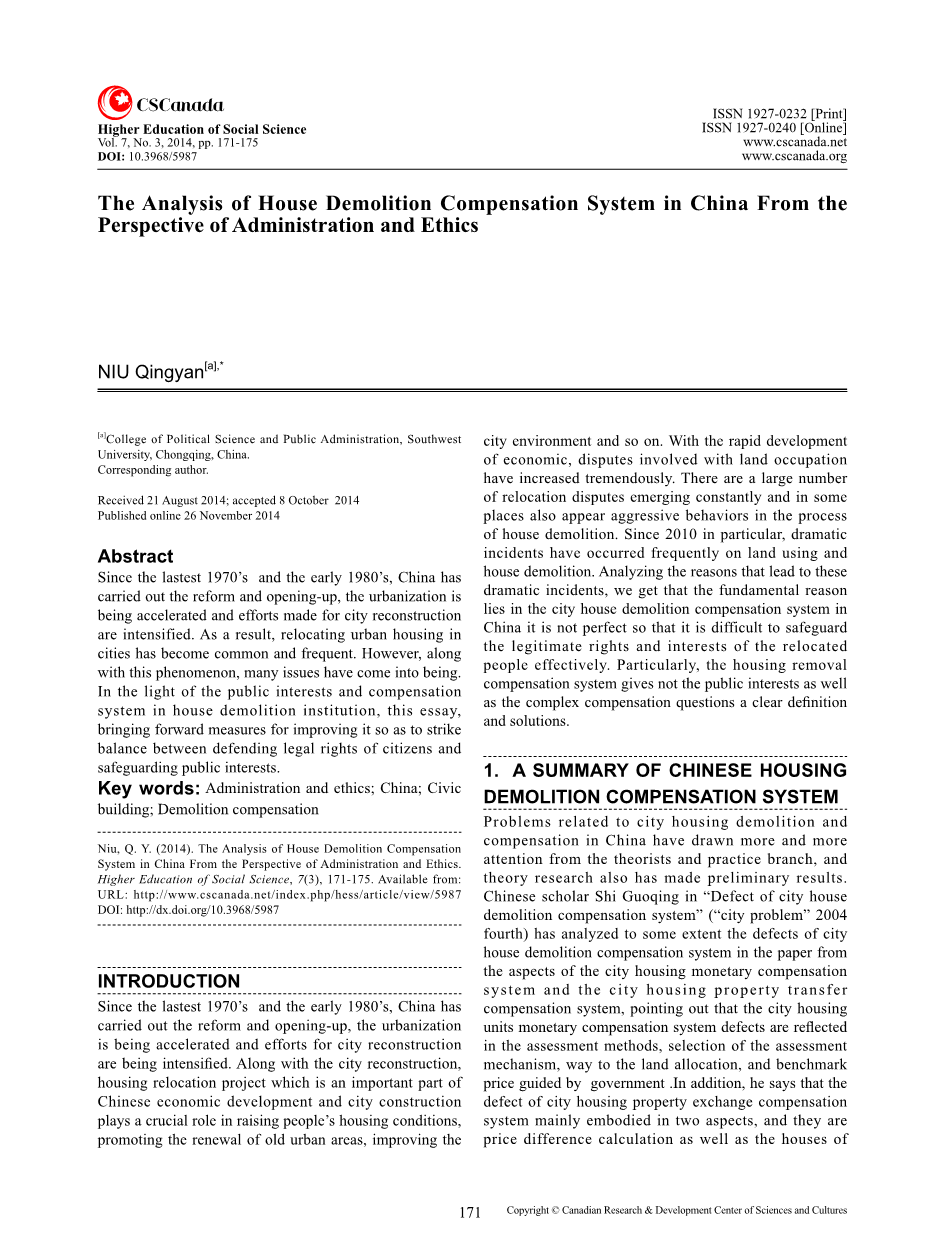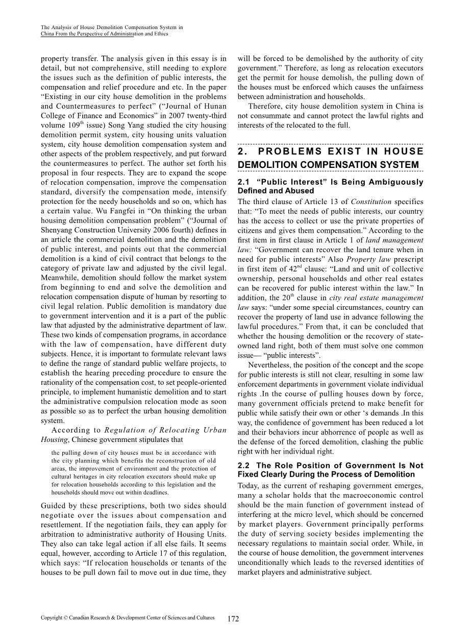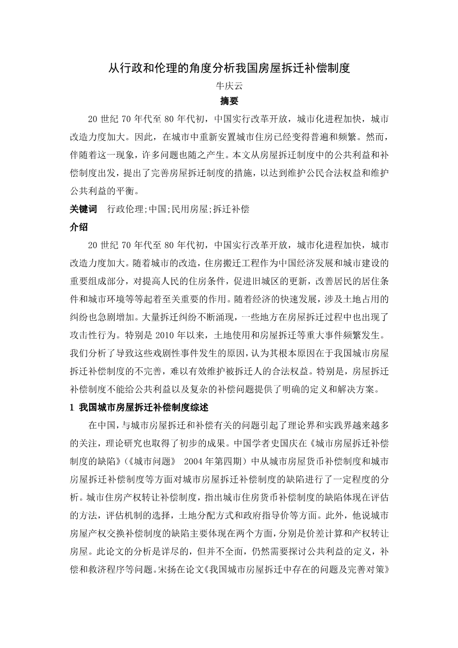 从行政和伦理的角度分析我国房屋拆迁补偿制度外文翻译资料