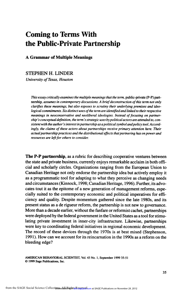 有了这些背景特征,我们现在可以尝试去理清P-P伙伴关系在当代讨论中的意义。正如标题所暗示的,这里采用了一种解构的形式来解构这个词的各种含义,并将它们的一些基本前提和意识形态承诺暴露在严格审查之下。解构主义策略隐含在前面的论据中,注重语境的概念性、意识形态性和语用性,以澄清意义的产生。然而,我在这篇文章的其余部分的意图要比全面的后结构主义分析所承认的要温和得多。我更愿意依赖某些演员对这个词的讨论性使用,而不是依靠唤起这个词的叙述性图像和故事,因为我的兴趣更多地倾向于政治思想和政策工具,而不是代表性策略。同样,关于合作关系的主张将受到关注,而不是合作关系实践,因为至少在这一点上,我更感兴趣的是概念上的澄清,而不是合作关系可能需要的权力或排除模式的运作(见Handler,1996年)。最后,我的澄清工作不会超出价值承诺的范围。关于本体论和形而上学谱系的问题还有一段时间。