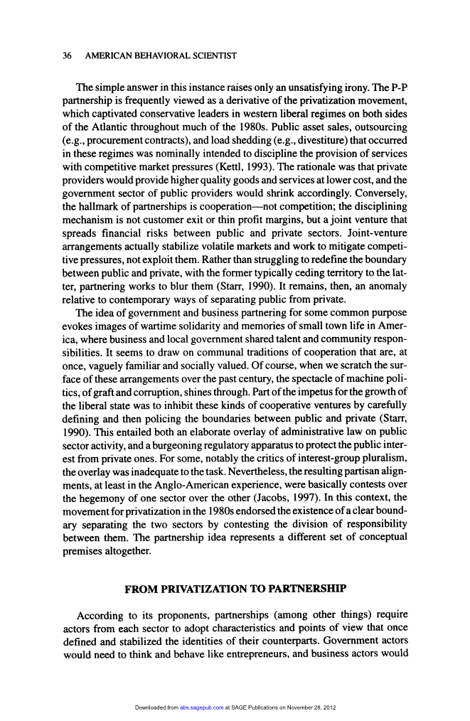 政府和商业伙伴关系的概念,为了一些常见的目的,唤起了战时团结和美国小镇生活的回忆,在美国,商业和地方政府共享人才和社区责任。它似乎借鉴了一些共同的合作传统,这些传统一下子就被以模糊的样子熟悉并受到社会的重视。当然,当我们在过去的一个世纪里揭开这些安排的面纱时,机器政治、贪污腐败的景象就大放异彩。自由主义国家发展的一部分动力是通过仔细界定公共和私人之间的界限,然后对其进行监管,从而抑制此类合作企业(Starr,1990)。这既需要对公共部门活动的行政法进行详尽的覆盖,也需要一个新兴的监管机构来保护公共利益不受私人利益的影响。对一些人来说,特别是对利益集团多元化的批评者来说,这项工作不足以完成。然而,由此产生的党派联盟,至少在英美经验中,基本上是一个部门对另一个部门霸权的争夺(Jacobs,1997)。在这种背景下,19世纪80年代的私有化运动通过对两个部门之间的责任划分提出质疑,认可了两个部门之间存在明确的界限。伙伴关系的概念完全代表了一组不同的概念前提。