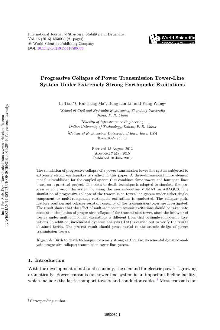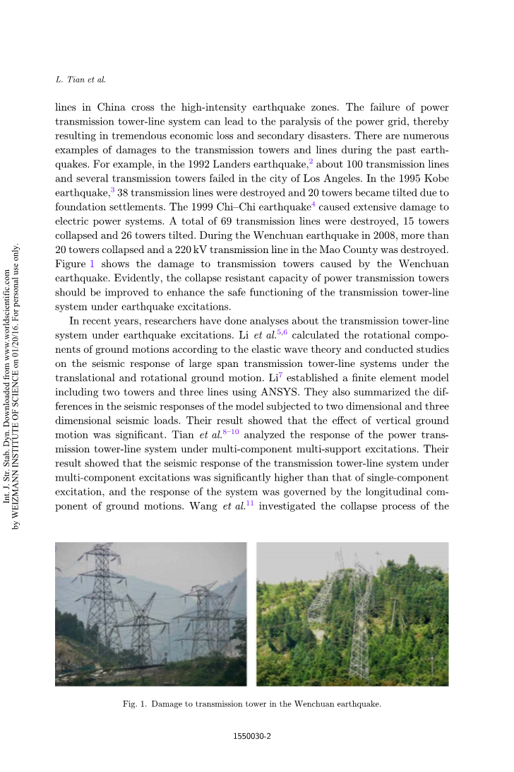近年来,研究人员对地震激波下的输电塔线系统进行了分析。李等人根据弹性波理论计算了地面运动的旋转分量,并对平移和旋转地面运动下大跨度输电塔系统的地震反应进行了研究。李建立了一个元素模型包括使用ANSYS的两塔三线。他们还总结了二维和三维地震荷载模型的地震反应差异。他们的结果表明,垂直地面运动的影响是显着的。 田等人分析了多组分多支持激励下电力传输塔线系统的响应。结果表明,多分量激发下输电塔系统的地震反应明显高于单组分激发,系统的响应受地面运动的纵向分量控制。 王等人研究了图的崩溃过程。沿纵向和横向的输电塔线系统采用断裂应变,重点放在材料的极限应变和应变率对崩塌模式和容量的影响。张等人提出了单塔和输电塔线系统的有限元模型,以通过诞生元素技术模拟风诱发的逐渐崩溃。姚等人利用非线性元素法分析了输电塔线系统中交叉臂的故障。他们也研究了薄板在传输塔全尺寸测试期间观察到的钢角截面的屈曲失效。 Alminhana等人通过使用明确的动态分析方案来了解导体断裂载荷下的公有和独立传输线塔的响应。他们的结果表明,峰值动态载荷的发生可能显着增加系统部件的内力。