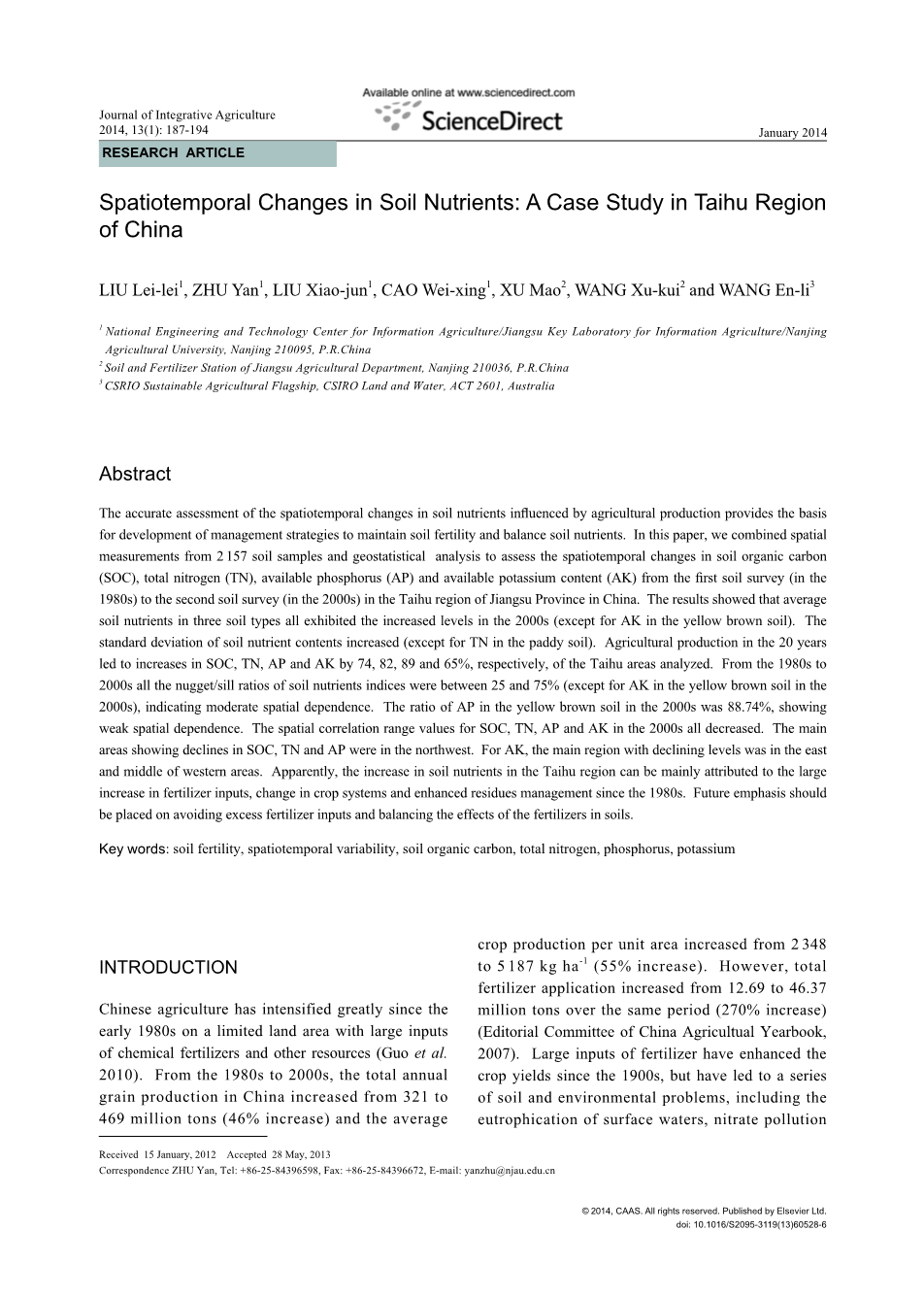 土壤养分水平是衡量土壤肥力的很重要的指标,同时对于维持农业生产和地球生物圈至关重要(Nael et al.2004)。过度施肥会导致农业非点源资源污染和环境退化,施肥不足又会影响农业作物产量与质量(Zaman and Schumann 2006)。因此,平衡土壤养分需要考虑一种必要措施维持土地肥力和作物产量同时减轻其对于环境的不利影响。土壤养分内在的空间变异性取决于成土过程、母质、地形等等。土壤养分空间分布模式可随土地利用和管理措施(轮作、耕作、残留管理、灌溉和施肥等)变化而发生显著变化,从而导致年复一年的时序变化(Cao and Zhou 2008)。准确评估农业生产对土壤养分时空变化的影响,可让我们了解变化如何是发生的,这些可作为制定平衡土壤养分与提高作物产量管理策略的基础(Sun et al. 2002,2003)。