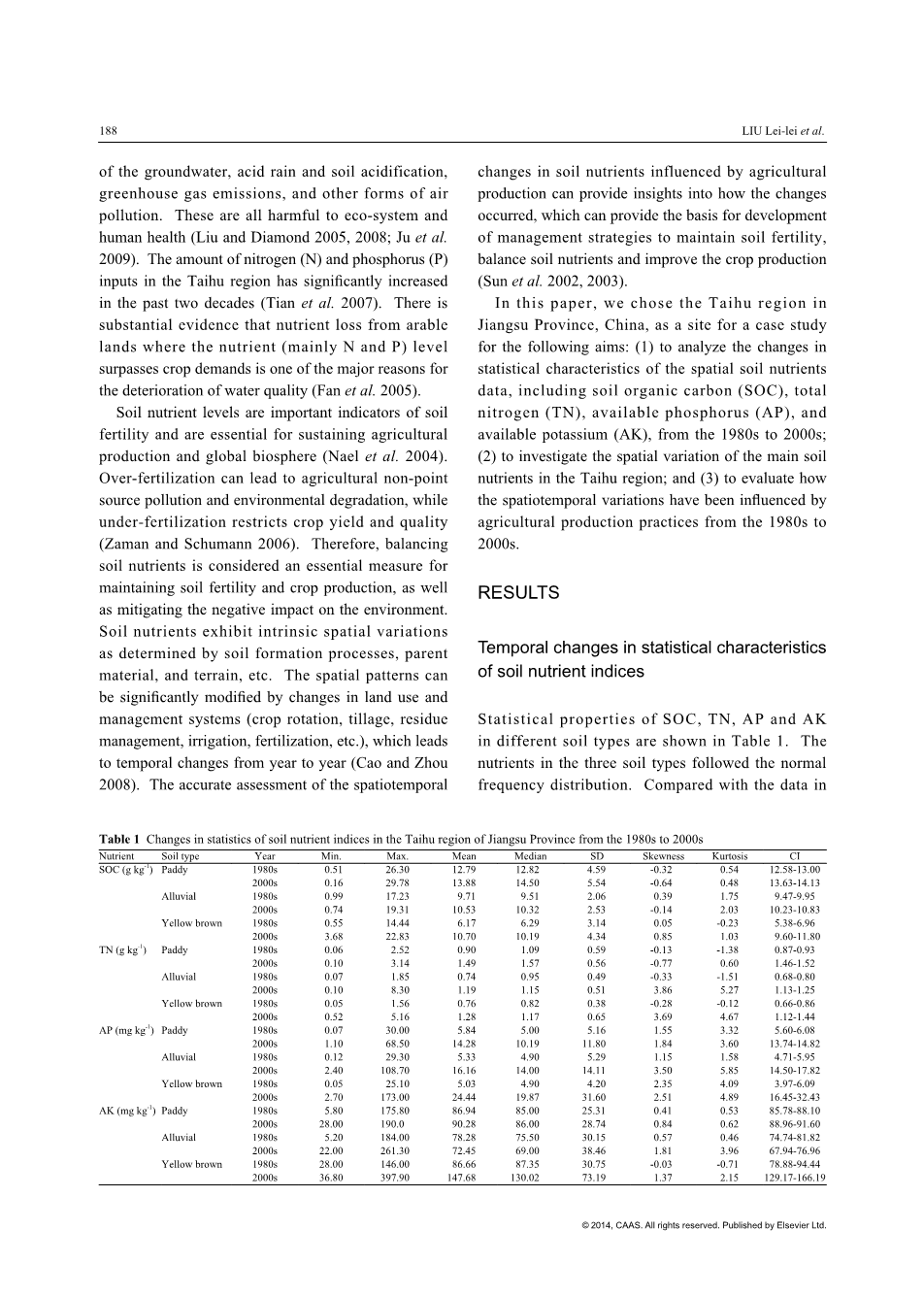 本文中,我们选择太湖地区(江苏片)作为案例研究点,主要目的如下:(1)分析1980年到2000年土壤有机碳、总氮、有效磷以及速效钾统计特征变化(2)调查太湖地区的主要土壤养分的空间变异(3)评价1980年到2000年间农业生产实践是如何影响土壤养分的时空变异。