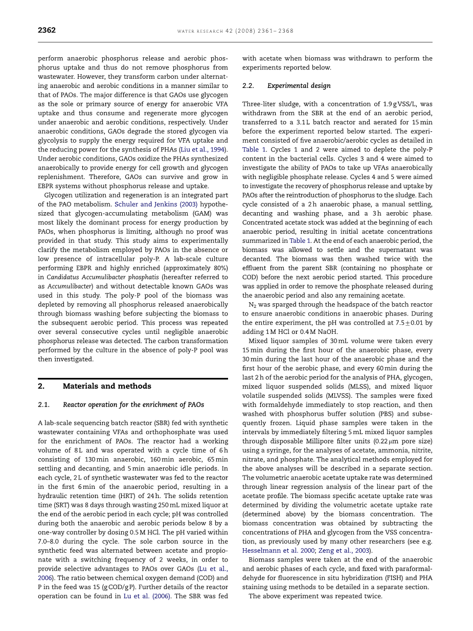 摘要:已知聚磷酸盐(poly-P)是富磷微生物(PAOs)代谢的关键化合物。在本研究中,我们使用一种高富集度(80%)的磷伏隔菌(下文简称PAO)污泥,研究这些微生物在多磷限制条件下厌氧利用醋酸盐的能力。生物量经历了多次厌氧和好氧循环,在此过程中,富磷微生物的聚磷酸盐池逐渐清空,供给磷酸盐不足的饲料,在每个厌氧周期结束时用不含磷的培养基洗涤生物量。三次循环后,磷基本不释放,但富磷微生物仍能吸附乙酸盐,并以聚羟基烷酸盐(PHA)的形式储存,post-FISH化学染色后可见。糖原降解显著增加,说明富磷微生物以糖原为主要能量来源。这是聚糖生物(聚糖生物)的一个关键特征,已知聚糖生物在增强生物除磷(EBPR)系统中与富磷微生物竞争。乙酸盐的摄取、多羟基丁酸盐(PHB)和多羟基戊酸盐(PHV)的产生、糖原的消耗与之前提出的聚糖生物厌氧模型吻合较好。
