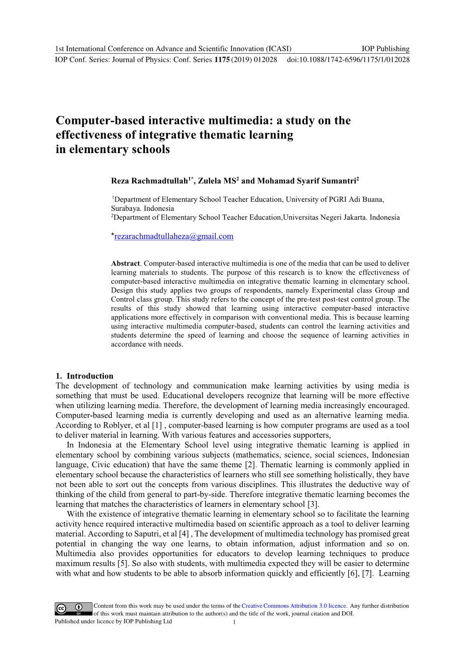 Reza Rachmadtullah,MS Zulela,Mohamad Syarif Sumantri. Computer-based interactive multimedia: a study on the effectiveness of integrative thematic learning in elementary schools[J]. Journal of Physics: Conference Series,2019,1175(1).