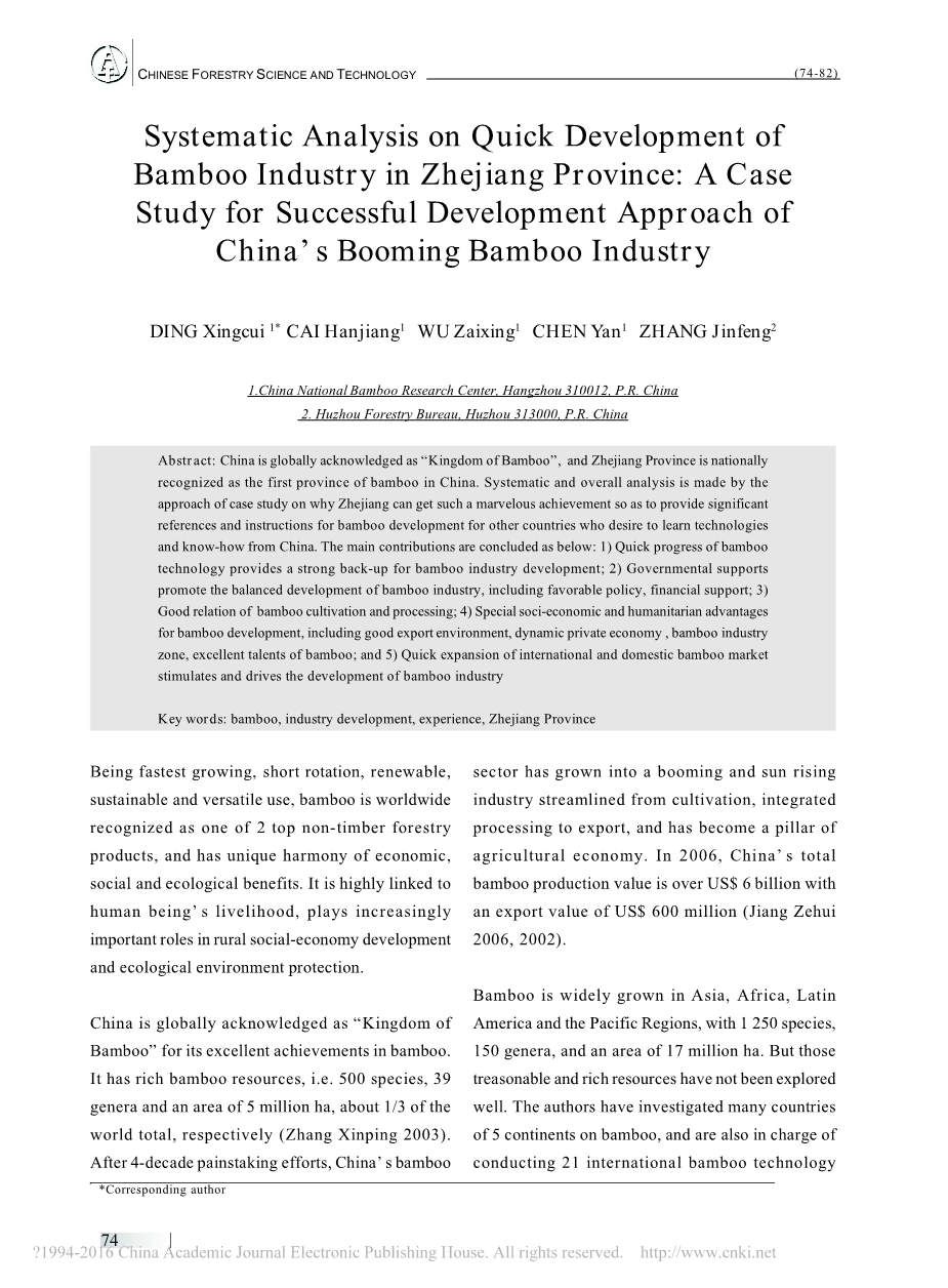 摘要:中国是全球公认的“竹子王国”,浙江省是全国公认的第一个竹林省。通过案例研究的方法,对浙江为何能取得如此惊人的成就,进行系统的、全面的分析,为其他渴望从中国学习技术和技术的国家提供重要参考和指导。主要贡献如下:1)竹材技术的快速发展为竹产业的发展提供了有力的支撑;2)政府支持促进竹业的均衡发展,包括优惠政策、财政支持;3)竹材栽培与加工的良好关系;4)竹材开发具有特殊的社会经济和人道主义优势,包括良好的出口环境、动态的民营经济、竹产业园区、优秀的竹人才;5)国际和国内竹材市场的快速扩张,刺激和带动了竹业的发展。