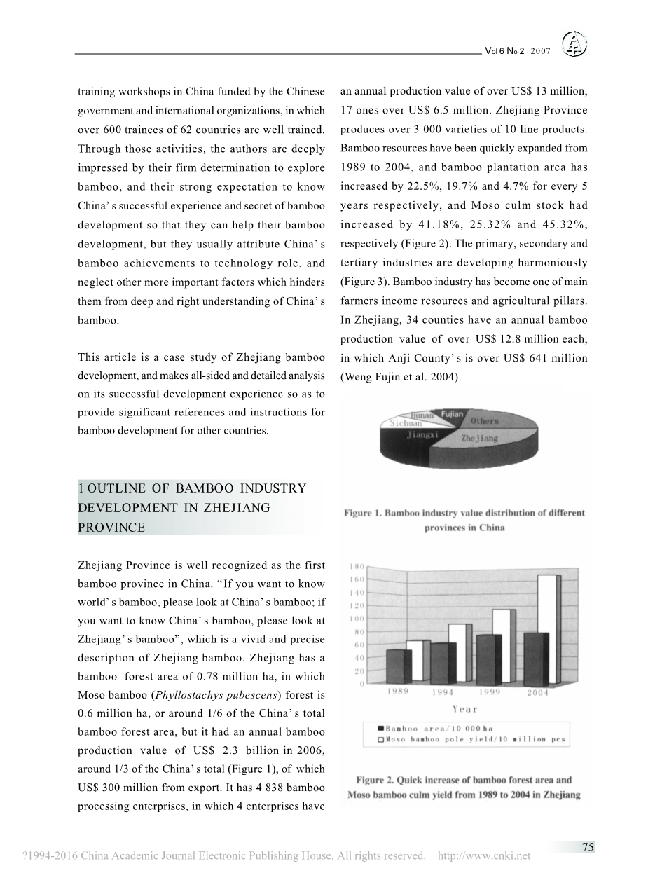浙江省是中国第一个竹林省。“如果你想知道世界上的竹子,请看中国的竹子;如果你想了解中国的竹子,请看浙江的竹子,这是浙江竹子的生动而准确的描述。浙江竹林面积078万公顷,其中毛竹竹(植被类型下毛竹)森林060万公顷,约1/6的中国“竹林总面积,但它有一个竹年产量的价值23亿美元的2006年,大约1/3的中国总(图1),其中3亿美元来自出口。公司拥有4 838家竹制加工企业,其中4家企业的年生产价值超过1300万美元,17家企业超过650万美元。浙江有3000多个品种的10线产品。竹子资源已经迅速扩大从1989年到2004年,和竹子种植面积增加了22.5%,每5年分别为19.7%和4.7%,毛竹煤粉股票在有皱纹的4比1。1 8%,2 5。3和4 5 2%。(图2)主要、二、三产业发展和谐(图3),竹产业已成为主要的农民收入来源和农业支柱之一。在浙江,34个县每年的竹子生产总值超过1280万美元,其中安吉县超过6.41亿美元(翁福金等,2004)。