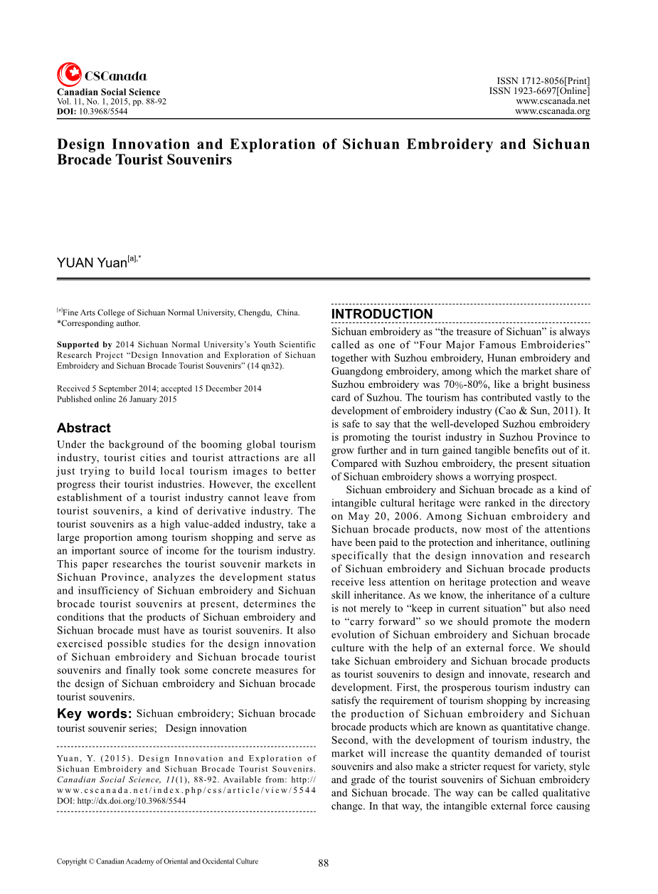 摘要:在全球旅游经济化的发展背景下,旅游城市以及旅游景点为了推动旅游业的更好发展,相继尝试树立具有当地特色的旅游形象。然而,建立一个发达的旅游业,离不开旅游业的衍生物——纪念品。旅游纪念品作为旅游业的高增值产业,在旅游购物中占有很大比例,是旅游业重要的经济收入来源之一。本文以四川旅游纪念品市场为研究对象,分析四川蜀绣蜀锦的发展现状以及不足,列举蜀绣蜀锦作为旅游纪念品的必要条件,同时还对蜀绣蜀锦的设计进行创新研究,最后对蜀绣蜀锦旅游纪念品的设计提出具体的措施建议。