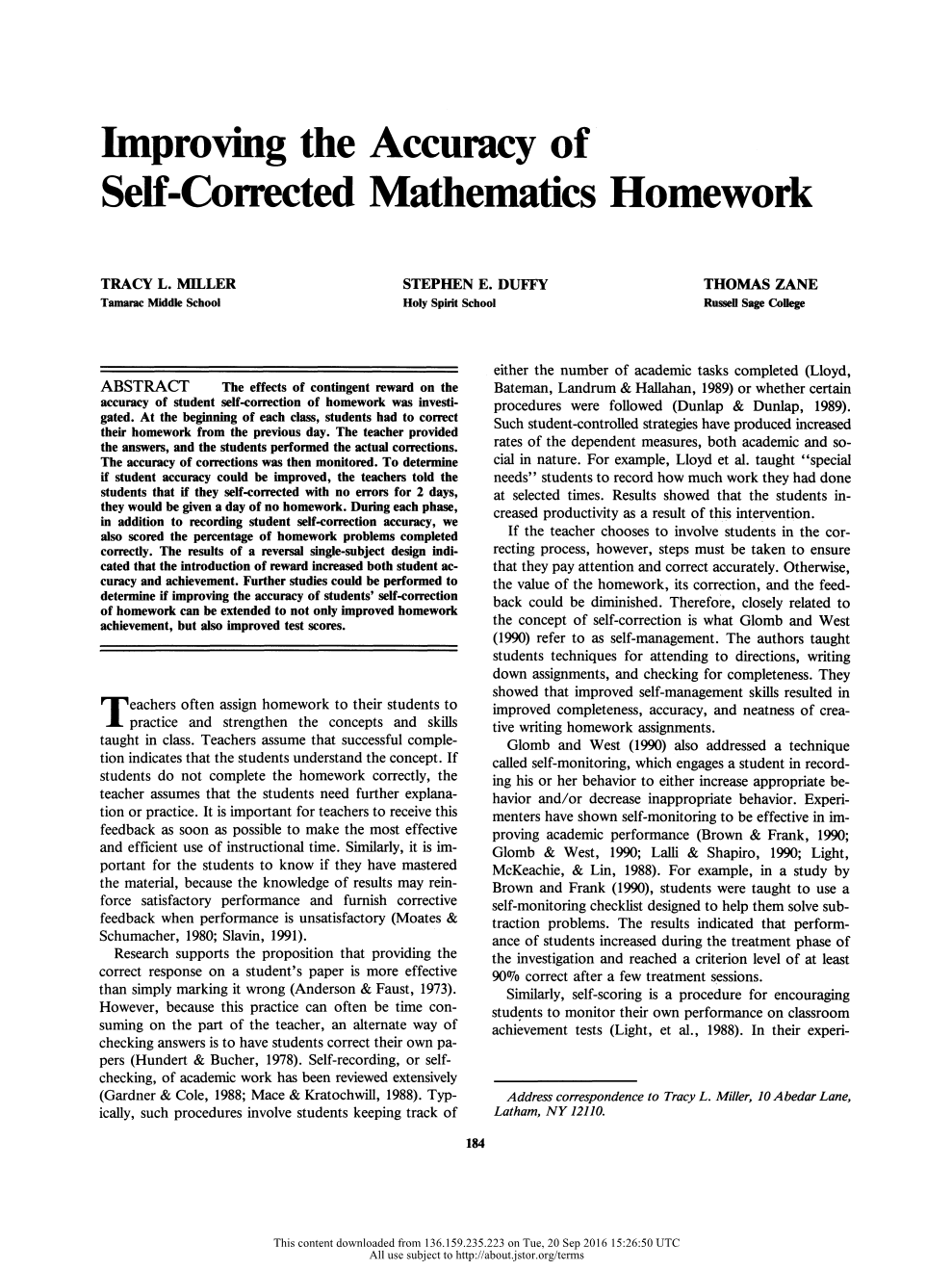在目前的研究中,我们将先前的发现扩展到学生自己的家庭作业的自我更正。研究人员发现,自我监控和自我评分技术对于提高学生的成绩和节省宝贵的教学时间都是有效的。自我校正是一种类似的技术,它可以让学生纠正自己的作业,从而节省宝贵的时间。在目前的调查中,我们试图确定对于自我修正的准确性的关注是否确实提高了学生的家庭作业成绩。