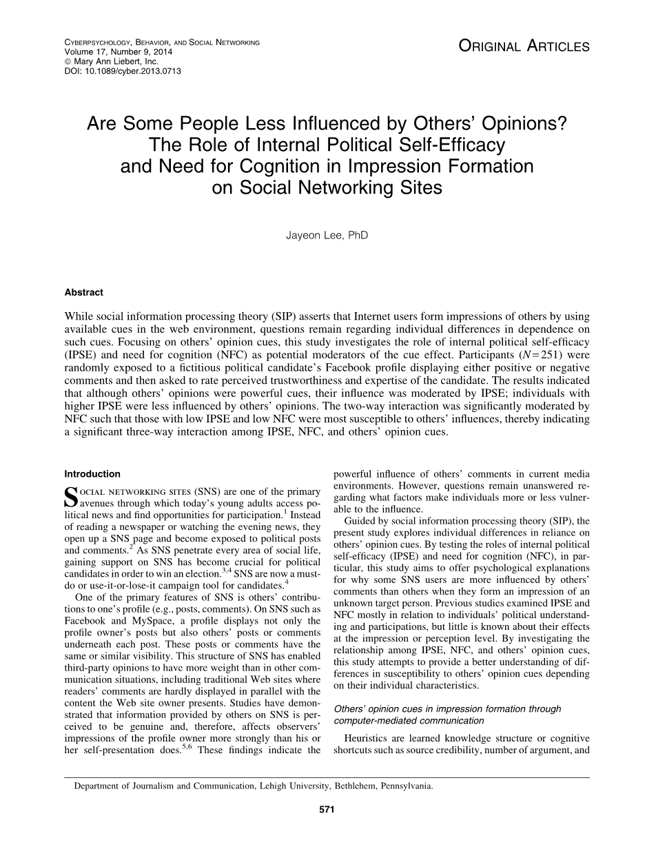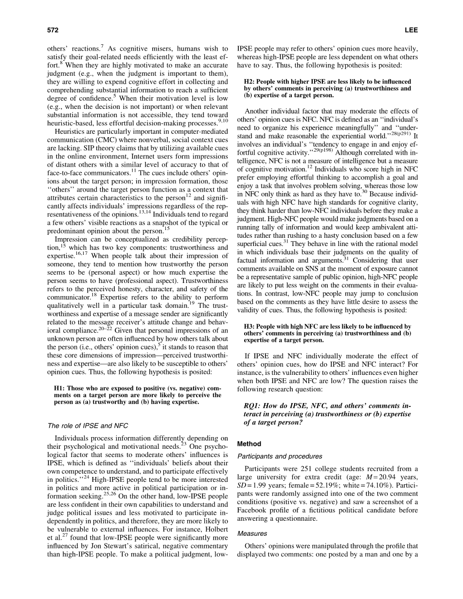 社交网络已经变成越来越重要的信息来源,对用这些信息的人们来说这是至关重要的调查机制。特别地,解决人们如何根据已有线索对一个不认识的人进行正确的判断也是至关重要的。本研究调查IPSE和NFC的作用相对于别人的观点暗示在印象形成的政治候选人的诚信和专业知识。正如所料,当没有其他信息或预制的态度一个人,别人的言论是强大的线索。这个结果可能有助于解释为什么政客们获得成功SNS能够在选举中取得成功。然而,参与者在多大程度上依赖于信号不同取决于IPSE和NFC。总的来说,人民IPSE越高,就越不容易被别人的意见。这意味着IPSE影响的程度取决于线索。这个结果增加了细微。发现IPSE能函数,作为一个关键的动机因素,温和派政治信息的影响。然而,NFC没有明显温和的提示效应。参与者