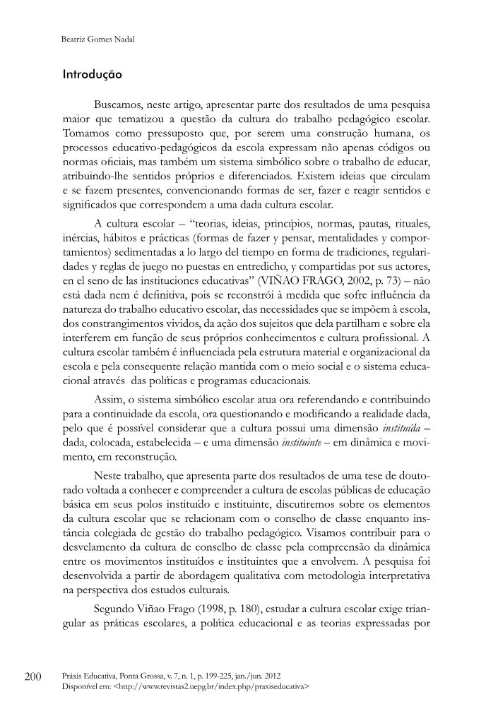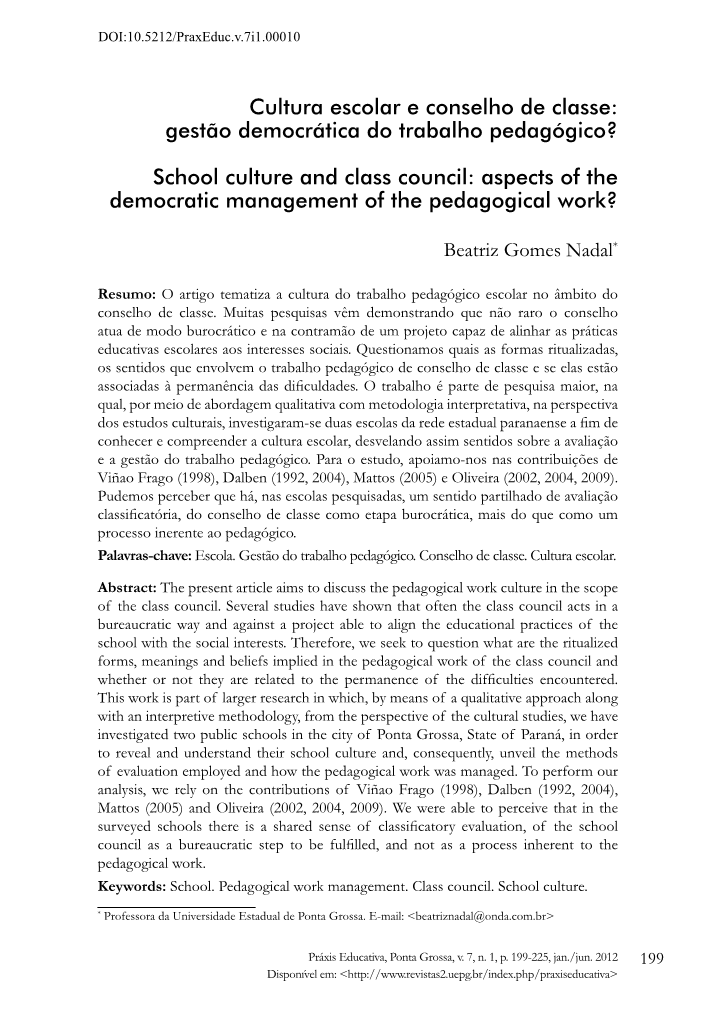 摘要:本文论述了学校教育工作在班级理事会中的文化。许多研究表明,委员会经常以一种官僚主义和合同的方式行事,这是一种学校教育实践与社会利益相一致的项目。我们讨论了哪些仪式化的形式,涉及到课堂咨询工作的感觉,以及它们是否与持续的困难有关。从文化研究的角度来看,这项工作是更大的研究的一部分,通过定性的方法和解释方法。调查了解帕拉纳州的两所学校,以了解和理解学校文化,从而揭示了评估的意义。在这项研究中,我们借鉴了Vinao Frago(1998)、Dalben(1992,2004) 、Mattos (2005) 和Oliveira (2002, 2004, 2009)的贡献,我们可以看到,在研究的学校里,有一种共同的感觉,即班级理事会是一个官僚阶段,而不是作为教学过程的一部分。