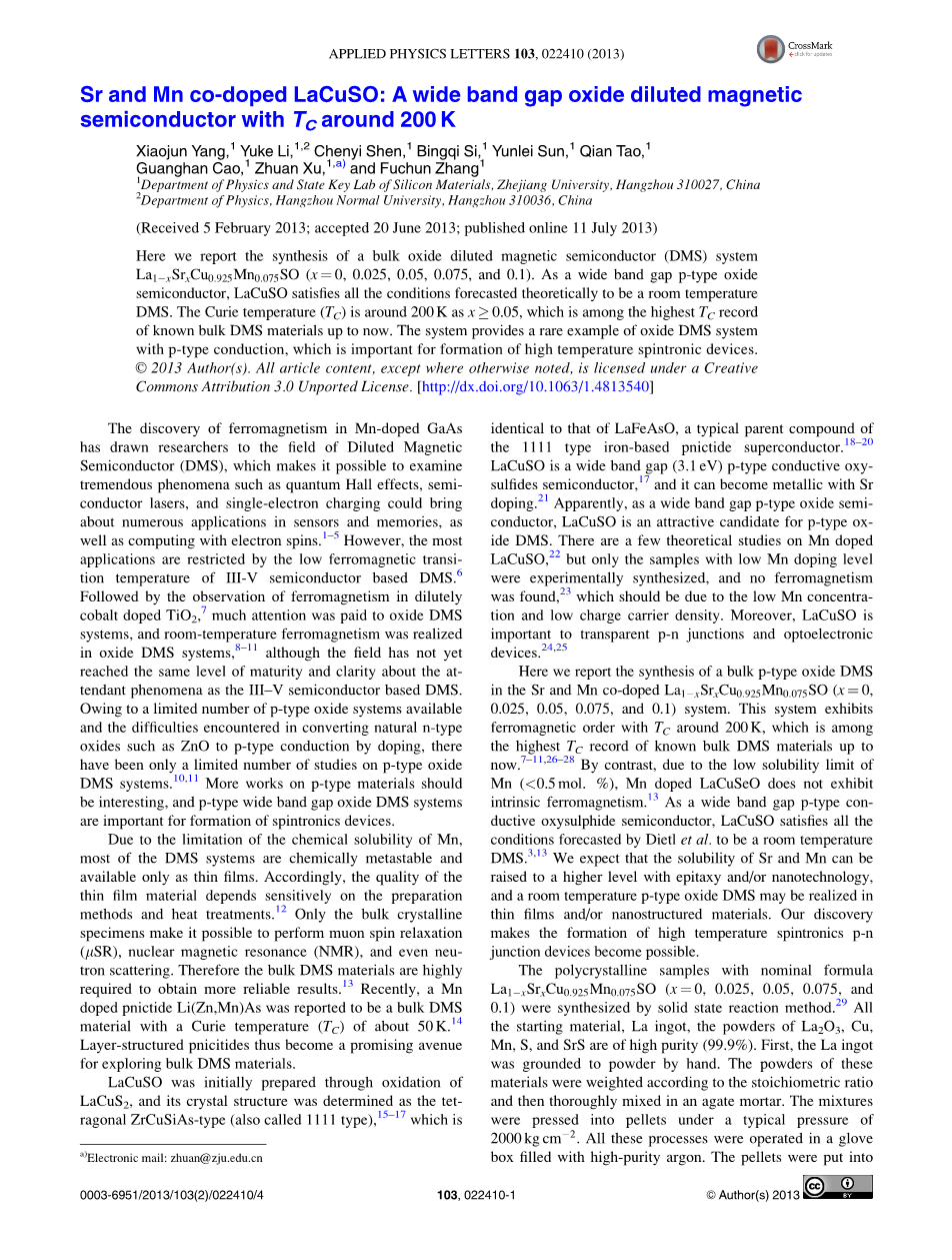 在这里,我们报告在Sr和Mn共掺杂的p型DMS氧化物La1 -xSrxCu0.925Mn0.075SO(x=0,0.025,0.05,0.075,和0.1)系统。该系统具有TC在200K的铁磁有序,这是已知块材的DMS材料目前最高Tc记录之一。相比之下,由于Mn的低溶解度的限制(<0.5。%),Mn掺杂LaCuSO没有表现出内在的铁磁性。LaCuSO作为一种宽带隙p型半导体的导电性,满足由Dietl等人预测的室温DMS的所有条件。我们预计,Sr和Mn的溶解度可提高到与外延和/或纳米技术的一个更高的水平,实现室温下的p型氧化物DMS块材。我们的发现使得高温电子学P-N结器件的形成成为可能。