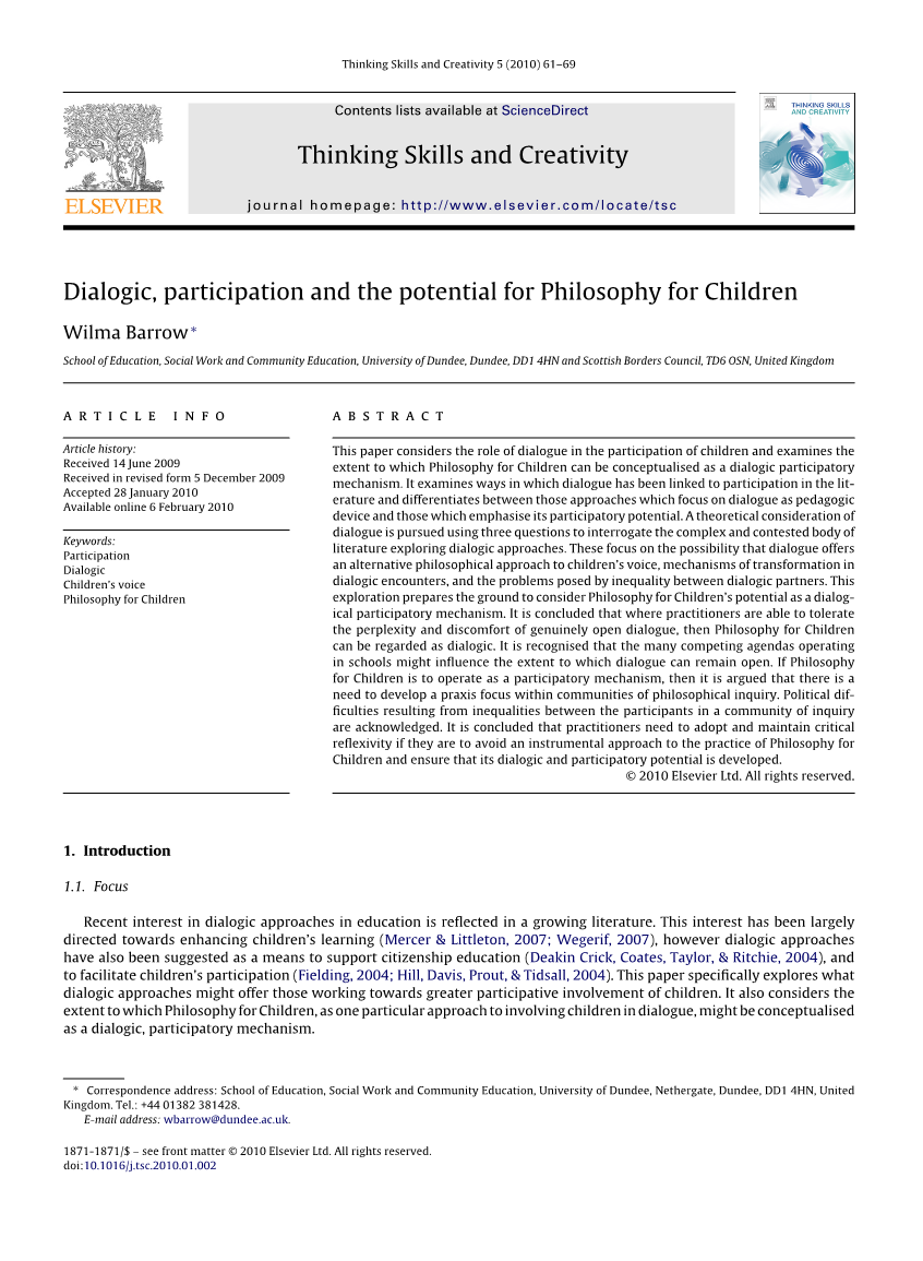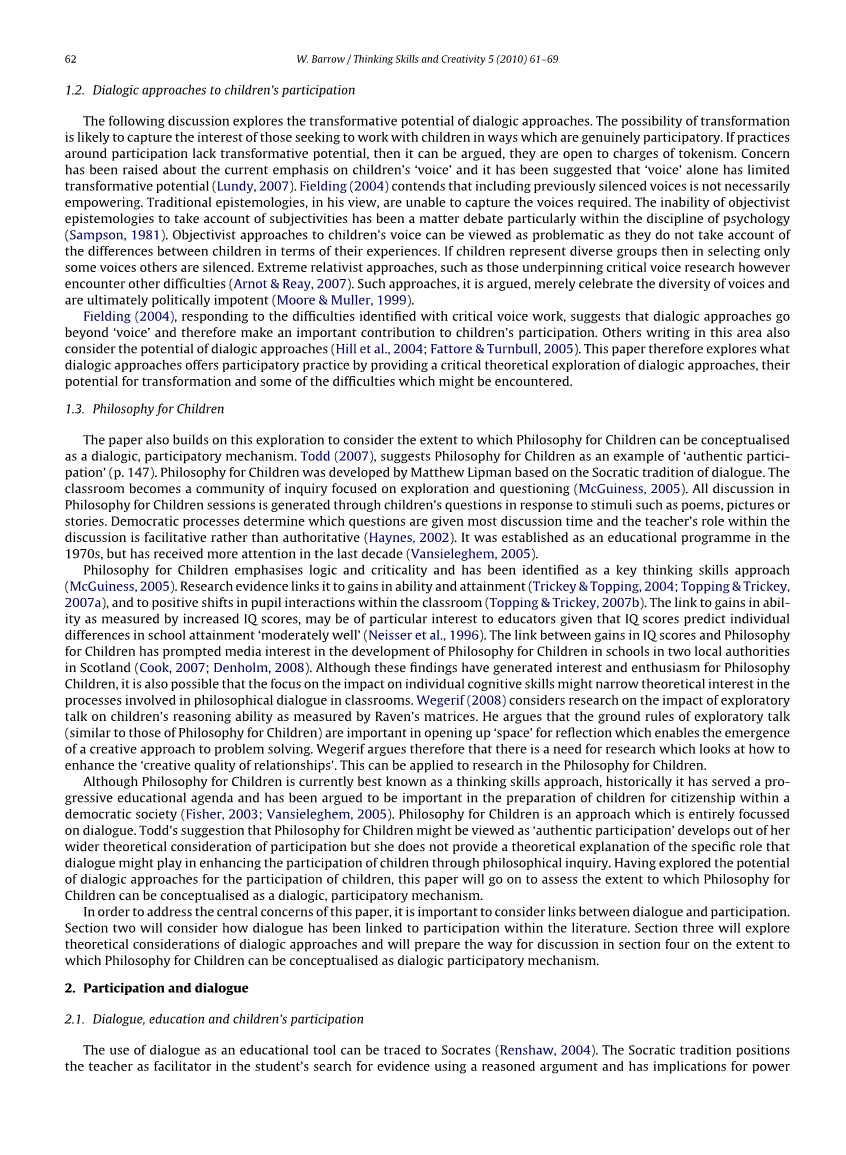 越来越多的文献反映了最近人们对对话教学法的兴趣。这种兴趣主要是为了提高儿童的学习(Mercer amp; Littleton, 2007;然而,对话方法也被建议作为支持公民教育的一种手段(Deakin Crick, Coates, Taylor, amp; Ritchie, 2004),并促进儿童的参与(Fielding, 2004;Hill, Davis, Prout, amp; Tidsall, 2004)。这篇论文特别探讨了对话性的方法可能为那些致力于儿童更大的参与性参与的工作提供什么。它还考虑到儿童哲学作为使儿童参与对话的一种特殊方法,可能在多大程度上被概念化为一种对话和参与机制。