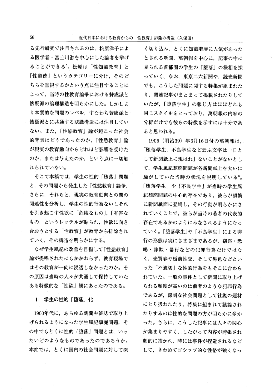 关于当时学生风纪颓废问题的先行研究,例如,在教育社会学的领域,涩谷知美对“性感”的观点进行了关注的分析。但是,学生风纪颓废问题为契机发生的“性教育”争论并没有提及这一点,事实历史充分地抑制好是很难的。