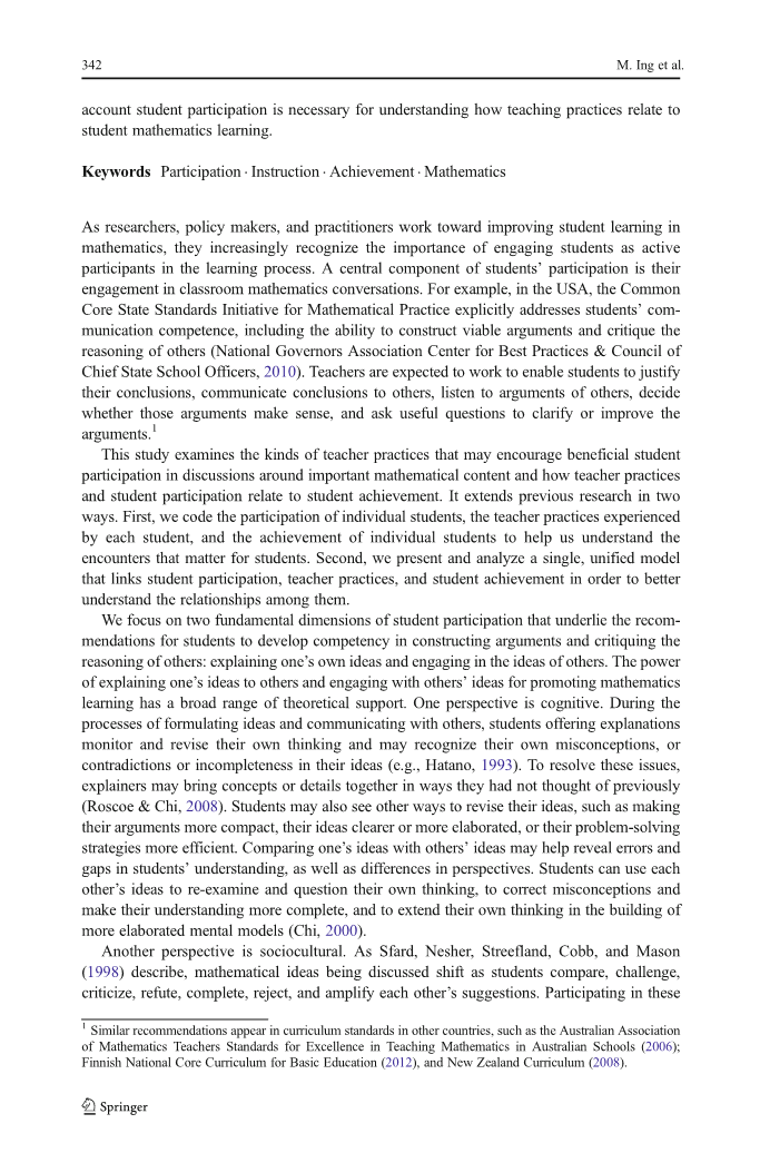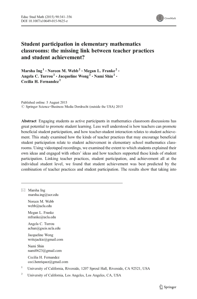 小学数学课堂中的学生参与:教师实践与学生成绩之间缺失的一环?外文翻译资料