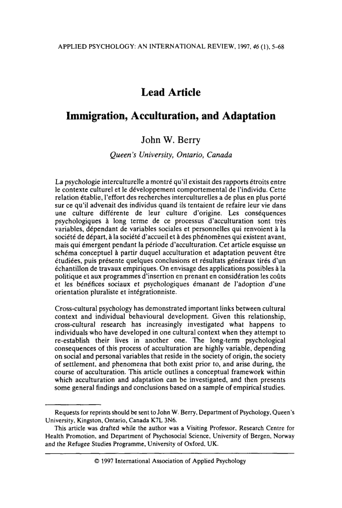 跨文化心理学已经证明了文化背景和个人行为发展之间的重要联系。鉴于这种关系,跨文化研究越来越多地调查了在一种文化背景下发展起来的个人在试图在另一种文化背景下重新建立自己的生活时会发生什么。这种文化适应过程的长期心理后果是高度可变的,取决于原籍社会和定居社会中的社会和个人变量,以及在文化适应过程中之前存在和出现的现象。本文概述了一个概念框架,在这个框架内可以对文化适应进行调查,然后根据实证研究的样本,提出一些一般性的发现和结论。提出了对公共政策和方案的应用。同时考虑了对这些问题采取多元主义和融合主义取向的社会和心理成本和好处。