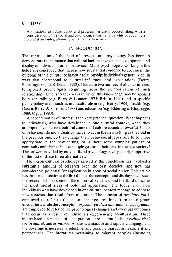 跨文化心理学是如何得出这一结论的,这涉及到过去几十年的大量研究,而且现在在社会政策领域有相当大的应用潜力。本文有三个主要部分:第一部分定义了这些概念,并展示了这些问题;第二部分概述了一些经验证据;第三部分指出了潜在应用的最有用领域。重点是在一种文化背景下发展起来的个人如何适应移民带来的新环境。适应的概念被用来指代这些群体接触所产生的文化变化,而心理适应和适应的概念则被用来指代个人在经历了文化适应后所产生的心理变化和最终结果。适应的三个相互关联的方面被确认:心理、社会文化和经济。由于这是一个庞大且快速变化的领域,其覆盖面必然是有选择性的,而且在内容和角度上可能有偏差。与移民有关的文献(包括移民、寄居者和难民),特别是在适应北美、澳大利亚,以及在较小程度上适应欧洲方面的研究得到了强调;在亚洲、非洲和南美环境中的研究基本没有(事实上,大多数文化适应发生在那里)。这种偏见反映了世界上某些民族的文献的可得性,而其他民族则没有。