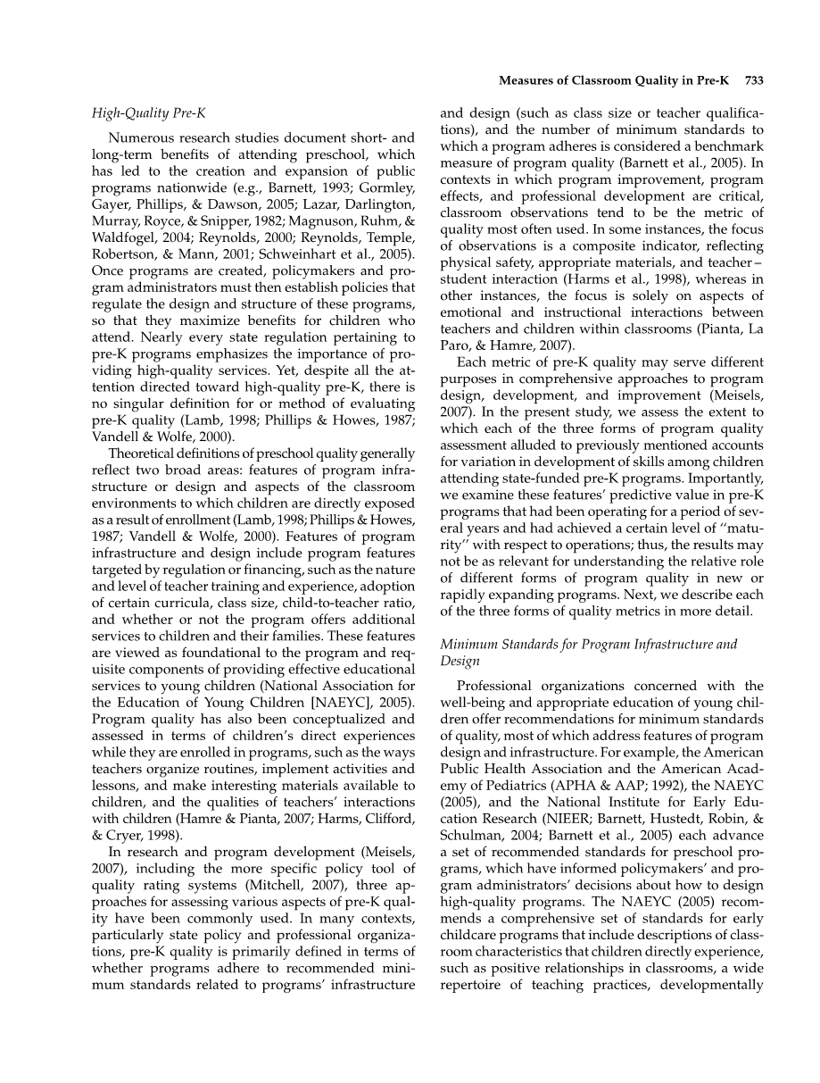 许多研究记录了上学前教育的短期和长期益处,这导致了全国范围内公共项目的创建和扩大(例如,巴内特,1993年;戈姆利、盖耶、菲利普斯和道森,2005年;拉扎尔、达林顿、默里、罗伊斯和斯奈珀,1982年;马格努森、鲁姆和沃尔德福格尔,2004年;雷诺兹,2000年;雷诺兹、坦普尔、罗伯逊和曼,2001年;施韦因哈特等人,2005年)。项目一旦创建,政策制定者和项目管理者就必须制定政策来规范这些项目的设计和结构,以便为参加这些项目的儿童带来最大利益。几乎所有与pre-K课程有关的州法规都强调提供高质量服务的重要性。然而,尽管所有的注意力都集中在高质量的pre-K上,但对于pre-K质量的评估并没有单一的定义或方法(Lamb,1998;Phillipsamp;Howes,1987;Vandellamp;Wolfe,2000)。