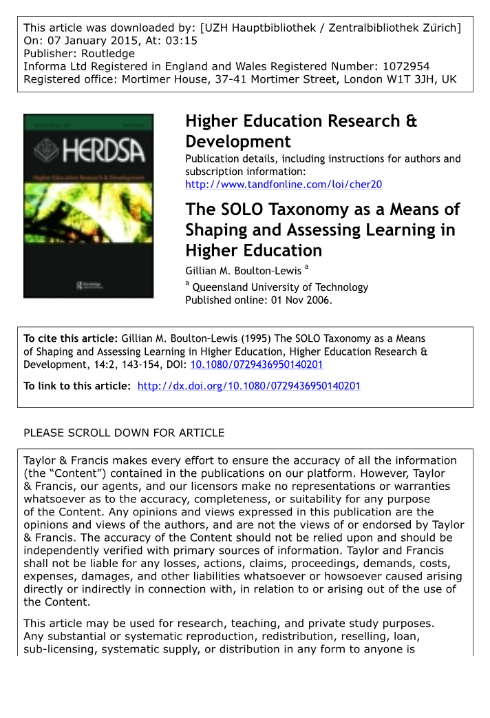 支持本文的高等教育理念是,它应该导致更高层次的思维。探讨建立在这样的假设上:高等教育中的授课者应该促使学生在他们所选择的学科中发展深刻的知识,如果有必要的话,可以改变他们的观念和世界观,并学会批判性思考。这意味着教师应该通过教学来达成这种结果(参见Samuelowicz和Bain, 1992; Prosser, Trigwell和Taylor, 1994)。本文描述了使用改编后的SOLO分类法作为影响和评估学习成果的一种方式,来促进高阶思维。
