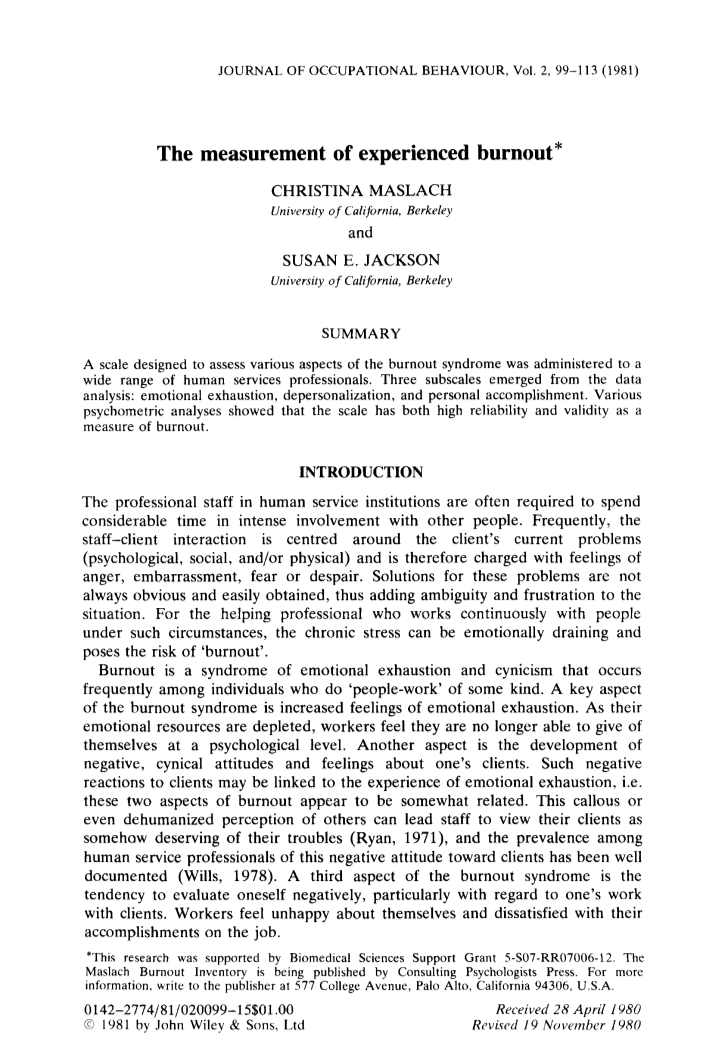 为了评估倦怠综合症的各个方面,对广泛的人类服务专业人员进行了量表评估。从数据分析中出现了三个分量表: 情绪衰竭,人格解体和个人成就。各种心理测量分析表明,该量表作为一种衡量倦怠的方法,具有高度的可靠性和有效性。