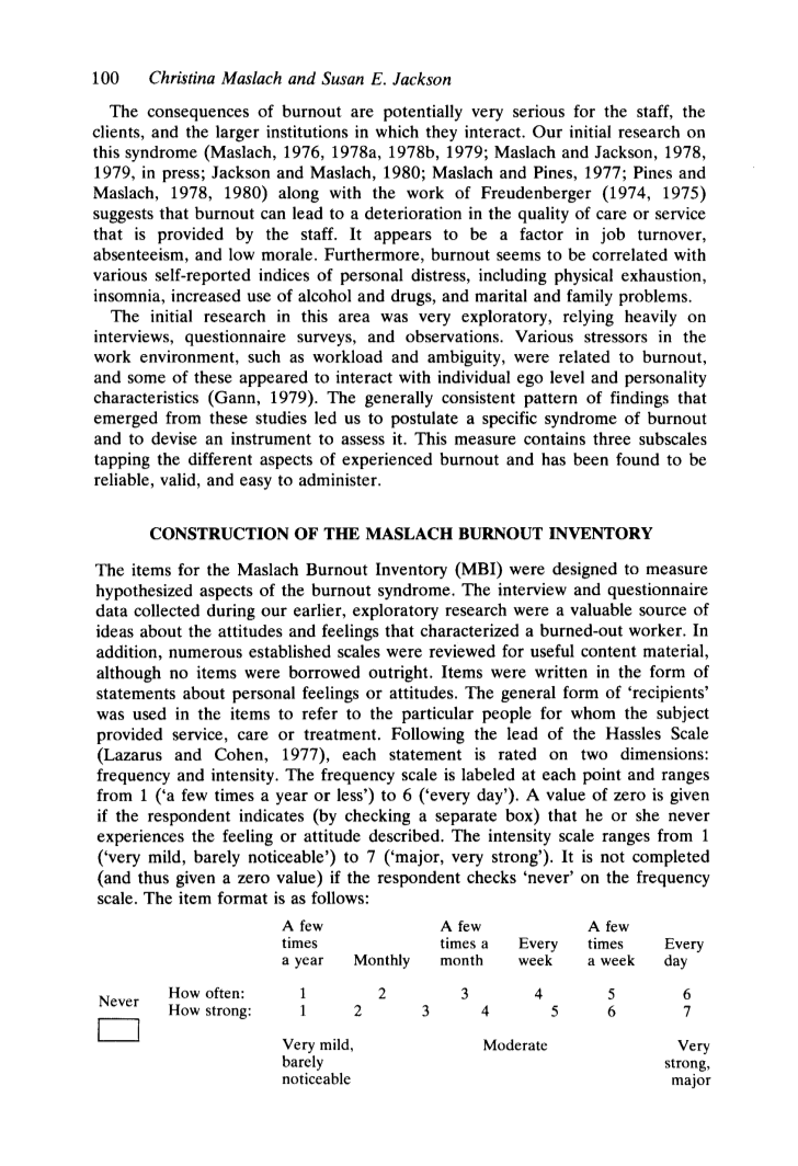 Maslach 职业倦怠量表(MBI)的项目被设计用来测量职业倦怠综合征的假设方面。