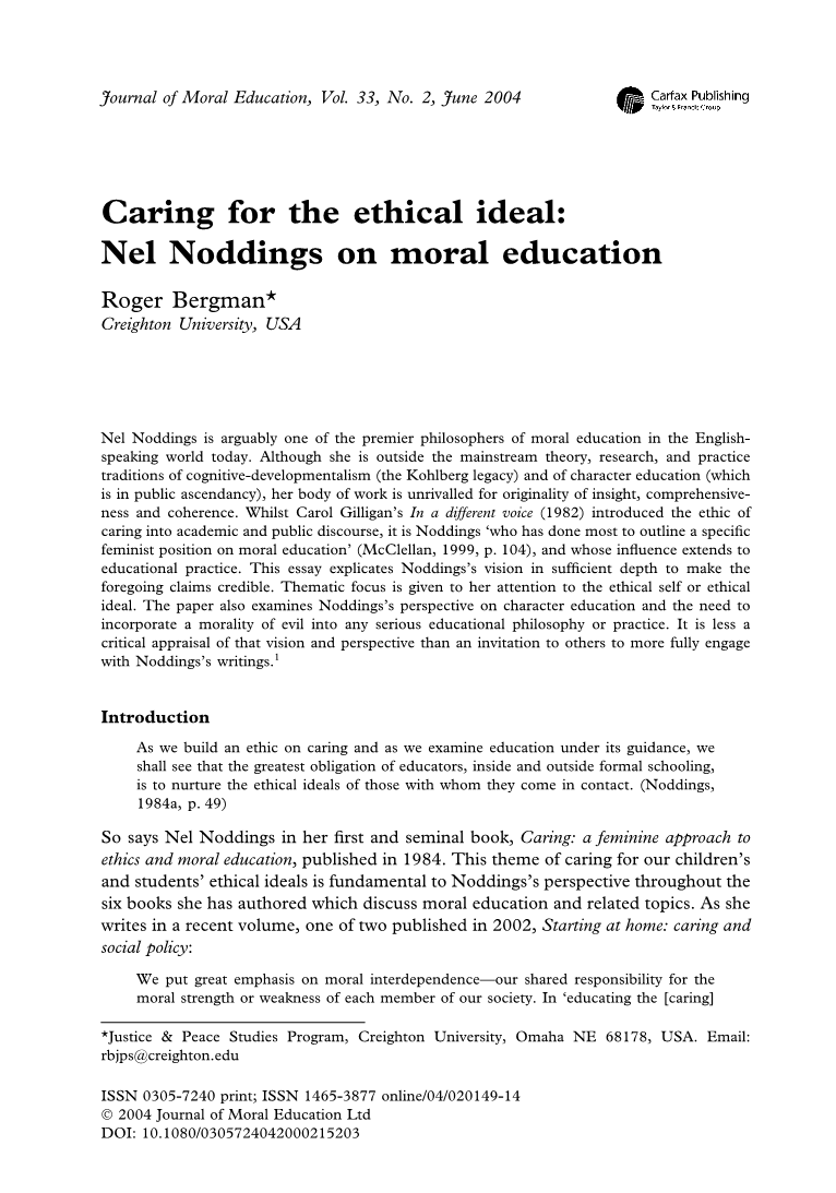 奈尔·诺丁斯可以说是当今英语世界道德教育的主要哲学家之一。尽管她不属于认知-发展主义(科尔伯格的遗产)和性格教育(在公众中占主导地位)的主流理论、研究和实践传统,但她的作品在洞察力、综合性和连贯性方面的独创性是无与伦比的。Carol Gilligan的《In a different voice》(1982)将关怀的伦理引入了学术和公共话语,而诺丁斯“在道德教育方面概述了女性主义的具体立场”(McClellan, 1999,第104页),其影响延伸到教育实践。这篇文章充分深入地阐述了诺丁斯的观点,使他的观点更加可信。主题集中在她对伦理自我或伦理理想的关注上。本文亦检视诺丁斯关于品格教育的观点,以及将邪恶道德纳入任何严肃的教育哲学或实践的必要性。与其说它是对这种视野和观点的批判性评价,不如说是邀请其他人更全面地接触诺丁斯的作品。1