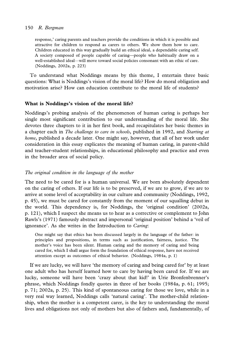 如果我们幸运的话,我们会拥有至少一个成年人“关心和被关心的记忆”,而这个成年人已经学会了如何通过被关心来关心别人。如果我们幸运的话,会有人“为这个孩子疯狂”!rsquo;,诺丁斯在她的三本书中引用了这句话(1984a,第61页;1995;p。71;2002年,25页)。这种对我们所爱之人的自发关爱,以一种非常真实的方式习得,诺丁斯称之为“自然关爱”。当母亲是一名称职的照料者时,母子关系是理解道德生活和义务的关键,不仅是母亲的,而且是父亲的,从根本上说,是父亲的