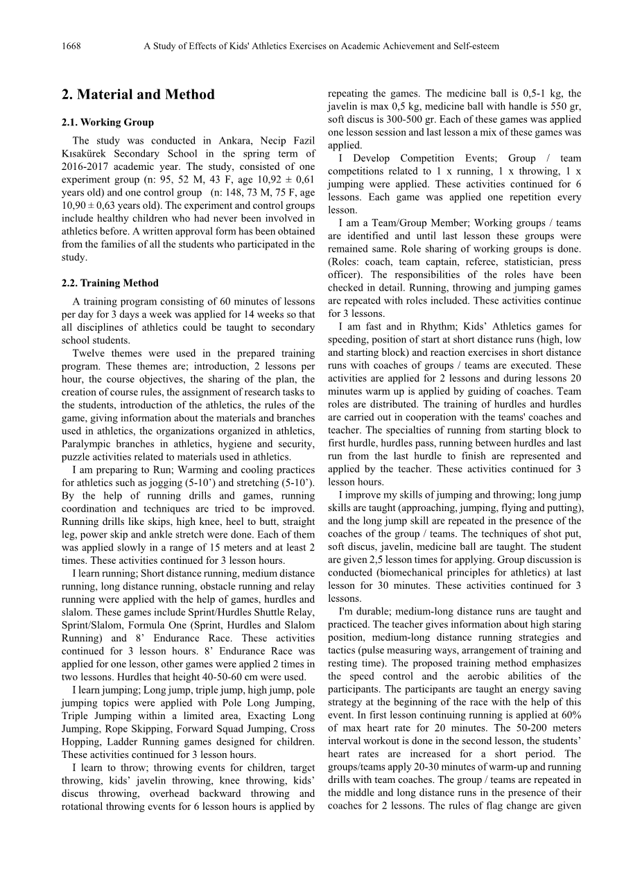 田径运动创造了一个良好的环境,让孩子们能够与他们的同龄人互动,因为比赛场地不同[2]。国际田径联合会(IAAF)开发了一个新的田径概念,该概念关注儿童的发展需求,这是无数研究的结果,这些研究完全以一种持续激发儿童运动热情和互动的方式为儿童设计比赛[2]。国际田联支持的2001年春季工作于2005年完成,该项目被命名为“国际田联儿童田径项目”[2]。这个词被表达为儿童体育运动和体育游戏。体育游戏将为孩子们提供机会,让他们在健康、教育和自我实现方面充分利用体育的有益实践[2]。在我们的工作中利用文献所表达的概念是身体活动,它是人类最基本的功能之一[3]。国家和国际组织已经表达了体育活动对人类健康的益处,这一点已被全世界所接受。除了体育活动对儿童身体的贡献外,对学业成就和自尊发展影响的研究吸引了许多研究人员。成功是衡量或指示个人从学校环境中的特定课程或学术计划中受益的程度。在学校取得成功;它可以被认为是学生在学术课程中的平均分数。学术成就;如果教学过程中设定的目标已经实现,则视为成功,否则视为失败。决定学生学习水平的学校考试实际上是成功的[4]。自尊是个人对价值的判断,表现为个人对自己的态度[5]。自尊与个体在高水平上的情绪状态有关,因为它意味着个体对自己的情绪。虽然高自尊的人可以说比那些对自己有积极情绪的人心情更积极,但低自尊的人也是如此[6]。自尊对心理健康和个人行为[7]、个人依从性和心理健康[8]都有积极的贡献。自尊对学校生活有积极影响,对个体的心理和心理健康也有积极影响。自尊高的人在面对困难时表现出更大的毅力[9]。
