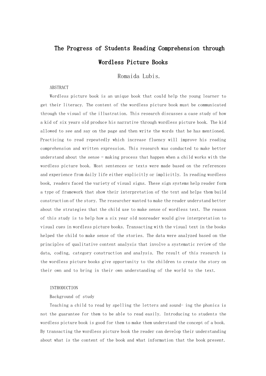 摘要: 无字绘本是一种独特的、能帮助年幼学生发展读写能力的读物。这个无字绘本的内容必须通过插图的视觉传达。本研究探讨了一个六岁小孩如何通过无字绘本来完成叙事的个案研究。这个孩子能根据页面内容看和说,然后研究者写下他提到的单词。反复的练习阅读能提高阅读的流畅性,可以提高他的阅读理解能力和书面表达能力。这项研究的目的是为了更好地理解当一个孩子使用无字绘本时,其中发生的意义建构过程。大多数句子或文本显性或隐性地以日常生活中的参考和经验为基础。在阅读无字书时,读者会面对各种视觉标志。这些标志系统帮助读者形成一种类型框架,这种框架能展示他们对文本的解读并帮助他们构建故事的结构。研究者想让读者更好地了解孩子理解无字绘本时使用的学习策略。这项研究的目的是帮助一个六岁的无阅读能力者,如何根据无字绘本中的视觉线索进行解读。处理书中的视觉文本来帮助孩子理解故事。数据分析将基于定性内容分析原则,包括对数据的系统回顾、编码、类别构建和分析。本研究的结果是无字绘本给了孩子们自己创造故事的机会,并能把自己对世界的理解带入文本中。