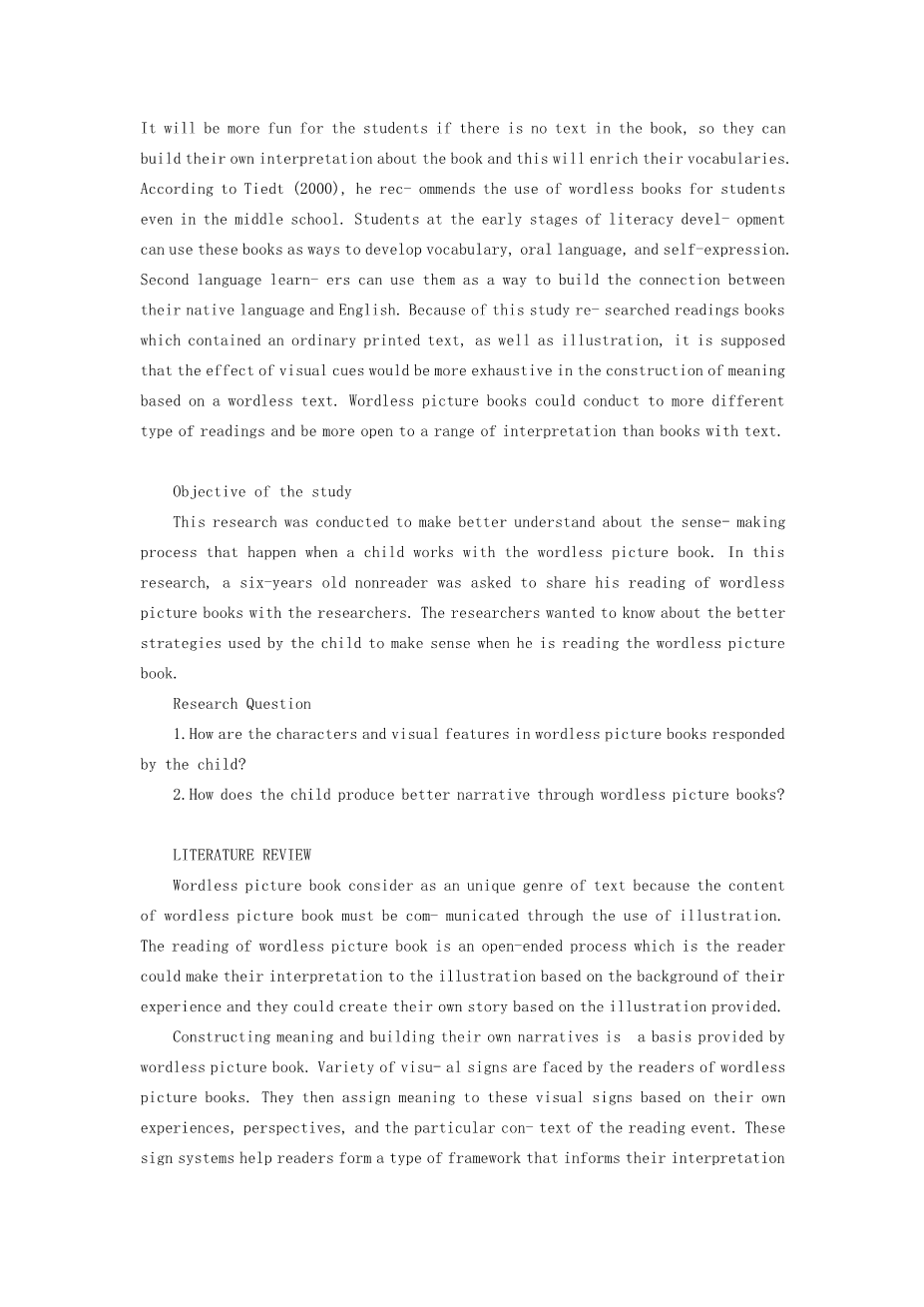 这项研究的目的是为了更好地了解儿童在使用无字绘本的过程中产生的意义。在这项研究中,一个六岁的无阅读能力者被要求与研究人员分享他对无字绘本的阅读。研究人员想知道孩子们在阅读无字绘本时使用的更好的策略。