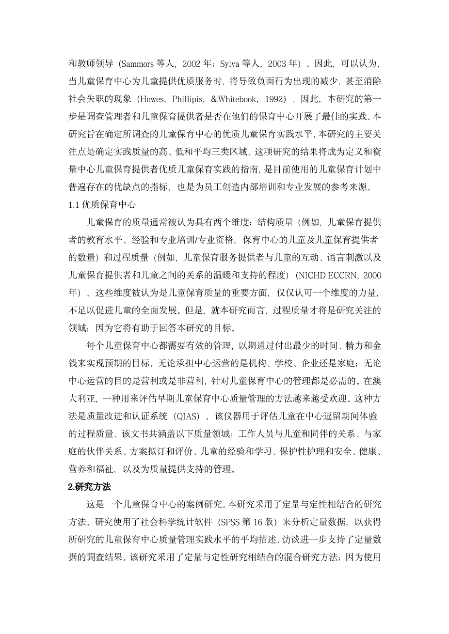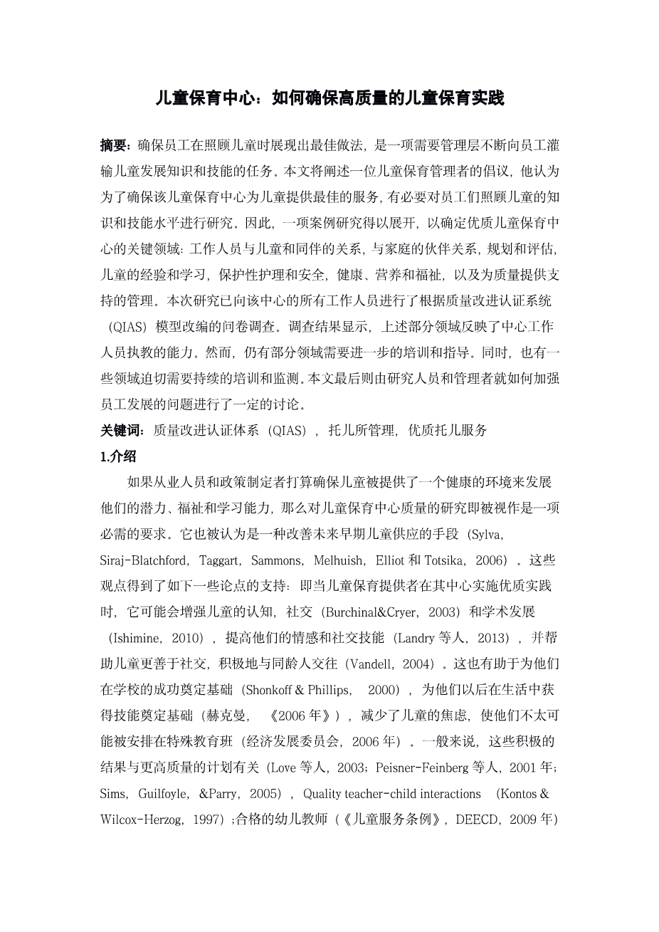 儿童保育中心:如何确保高质量的儿童保育实践外文翻译资料 2023-04-04 11:25:32 英语原文共 12 页,剩余内容已隐藏,支付完成后下载完整资料 英语译文共 16 页,剩余内容已隐藏,支付完成后下载完整资料 资料编号:[590775],资料为PDF文档或Word文档,PDF文档可免费转换为Word 您需要先支付 30元 才能查看全部内容!立即支付 发小红书推广免费获取该资料资格。点击链接进入获取推广文案即可: Ai一键组稿 | 降AI率 | 降重复率 | 论文一键排版 PREVIOUS NEXT 您可能感兴趣的文章 浅析“ばかりか”和“どころか”的异同开题报告 日本刀の模様开题报告 日本の化粧史について文献综述 颜色词“紫”的语义考察及文化内涵分析文献综述 中日独身問題の分析と考察开题报告 日本の文学作品から見る日本の癒やし系文化开题报告 関ヶ原の戦いに関する再考察ー正当性を中心に文献综述 中国古诗词的意象表达与翻译——以许渊冲先生的古诗词译著为例开题报告 论林纾小说翻译中的豪杰译现象——以《黑奴吁天录》及《巴黎茶花女遗事》为例文献综述 “一带一路”国家来华留学生择校影响因素研究—以江苏省为例开题报告