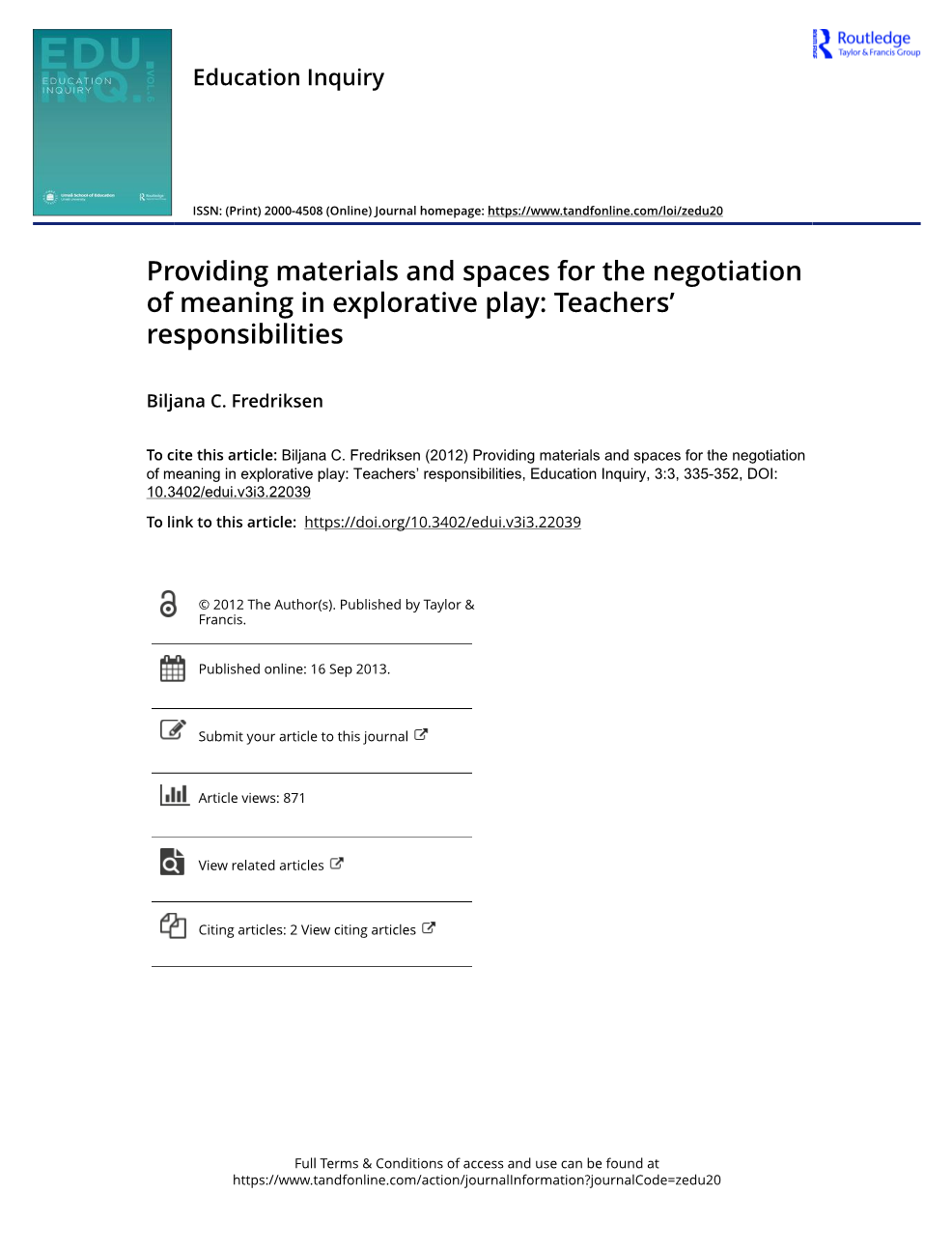 在北欧幼儿园的传统中,幼儿被视为知识的积极构建者(经合组织,2006年)。根据《挪威幼儿园法》,儿童应为其幼儿园的环境作出贡献,其教师有义务为这类贡献提供条件(教育和研究部,2005年)。本文认为,教师对儿童探索性游戏材料的选择既可以构建课程(弗雷德里克森,2010),也可以为儿童的个人贡献提供空间,但只有当教师的态度允许这些贡献的时候。