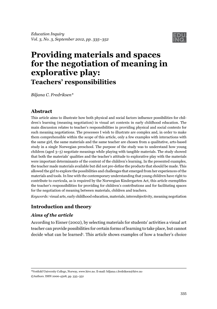 本文旨在说明身体和社会因素如何影响儿童视觉艺术背景学习(即谈判)的可能性。主要讨论涉及教师为这种意义谈判提供物理和社会环境的责任。我想说明的过程是复杂的,为了使他们理解本文的范围内,只有几个例子与同一个女孩的交往情况,在一个挪威幼儿园选择相同的材料和相同的老师从定性的基于艺术的研究。这项研究的目的是了解儿童(3-5岁)在玩有形材料时是如何协商意义的。研究表明,材料的质量和教师对材料的探索性游戏的态度都是影响儿童学习内容的重要决定因素。在所展示的例子中,教师提供了材料,但没有预先定义应该制作的产品。这让女孩可以从她的材料和工具的经验中探索可能性和挑战。符合当代的理解,幼儿有权贡献课程,正如挪威幼儿园法案所要求的,本文例证了教师的责任是提供孩子的贡献和促进空间谈判材料、孩子和老师之间的意义。