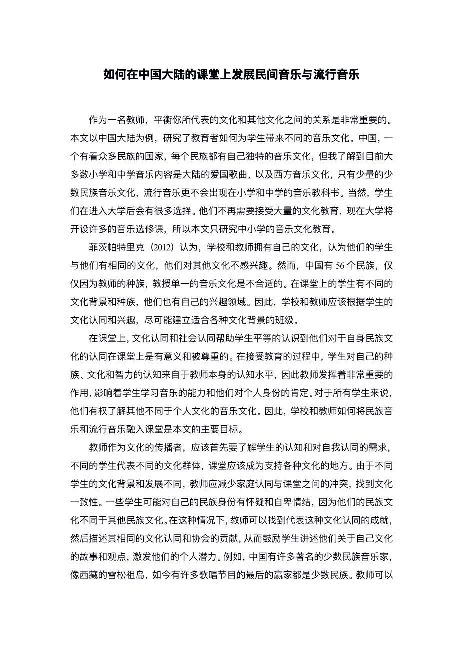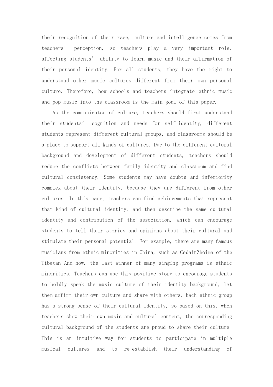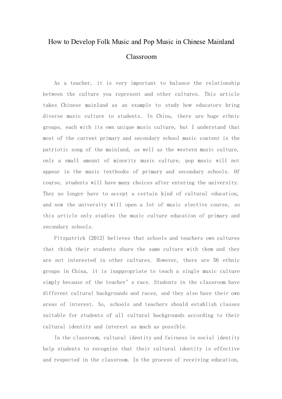 如何在中国大陆的课堂上发展民间音乐与流行音乐外文翻译资料 2023-06-15 16:30:27 英语原文共 3 页,剩余内容已隐藏,支付完成后下载完整资料 英语译文共 2 页,剩余内容已隐藏,支付完成后下载完整资料 资料编号:[604078],资料为PDF文档或Word文档,PDF文档可免费转换为Word 您需要先支付 30元 才能查看全部内容!立即支付 发小红书推广免费获取该资料资格。点击链接进入获取推广文案即可: Ai一键组稿 | 降AI率 | 降重复率 | 论文一键排版 PREVIOUS NEXT 您可能感兴趣的文章 浅析“ばかりか”和“どころか”的异同开题报告 日本刀の模様开题报告 日本の化粧史について文献综述 颜色词“紫”的语义考察及文化内涵分析文献综述 中日独身問題の分析と考察开题报告 日本の文学作品から見る日本の癒やし系文化开题报告 関ヶ原の戦いに関する再考察ー正当性を中心に文献综述 中国古诗词的意象表达与翻译——以许渊冲先生的古诗词译著为例开题报告 论林纾小说翻译中的豪杰译现象——以《黑奴吁天录》及《巴黎茶花女遗事》为例文献综述 “一带一路”国家来华留学生择校影响因素研究—以江苏省为例开题报告