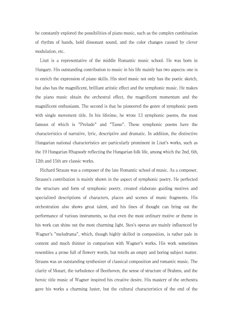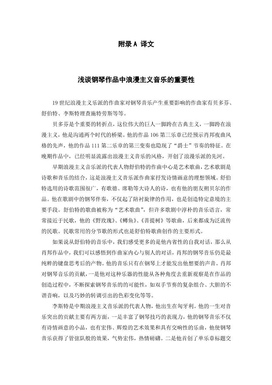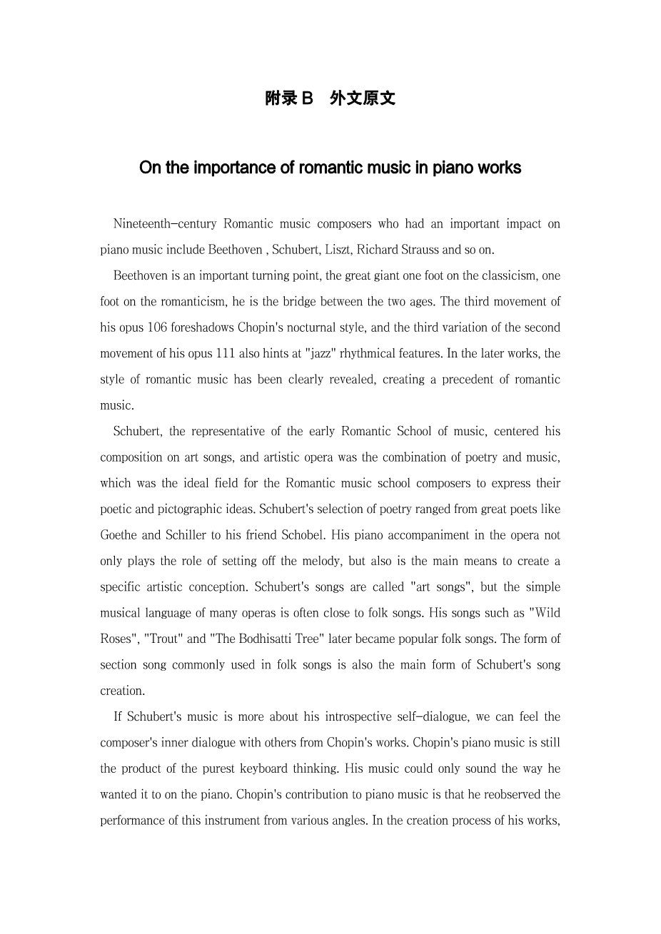 浅谈钢琴作品中浪漫主义音乐的重要性外文翻译资料 2023-07-28 10:49:38 英语原文共 3 页,剩余内容已隐藏,支付完成后下载完整资料 英语译文共 2 页,剩余内容已隐藏,支付完成后下载完整资料 资料编号:[604729],资料为PDF文档或Word文档,PDF文档可免费转换为Word 您需要先支付 30元 才能查看全部内容!立即支付 发小红书推广免费获取该资料资格。点击链接进入获取推广文案即可: Ai一键组稿 | 降AI率 | 降重复率 | 论文一键排版 PREVIOUS NEXT 您可能感兴趣的文章 浅析“ばかりか”和“どころか”的异同开题报告 日本刀の模様开题报告 日本の化粧史について文献综述 颜色词“紫”的语义考察及文化内涵分析文献综述 中日独身問題の分析と考察开题报告 日本の文学作品から見る日本の癒やし系文化开题报告 関ヶ原の戦いに関する再考察ー正当性を中心に文献综述 中国古诗词的意象表达与翻译——以许渊冲先生的古诗词译著为例开题报告 论林纾小说翻译中的豪杰译现象——以《黑奴吁天录》及《巴黎茶花女遗事》为例文献综述 “一带一路”国家来华留学生择校影响因素研究—以江苏省为例开题报告