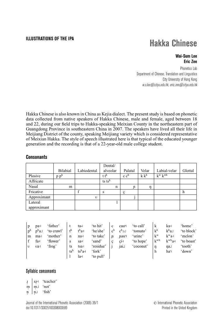 客家汉语在中国也被称为客家方言。本研究基于2007年在中国东南部广东省东北部梅县的实地考察期间,从18岁至22岁的客家中国人,男性和女性的母语人士收集的语音数据。演讲者一生都住在县城梅江区,讲梅江品种,被认为是梅县客家的代表。这里所说的演讲风格是受过良好教育的年轻一代的典型风格,录音是一名22岁的男大学生。