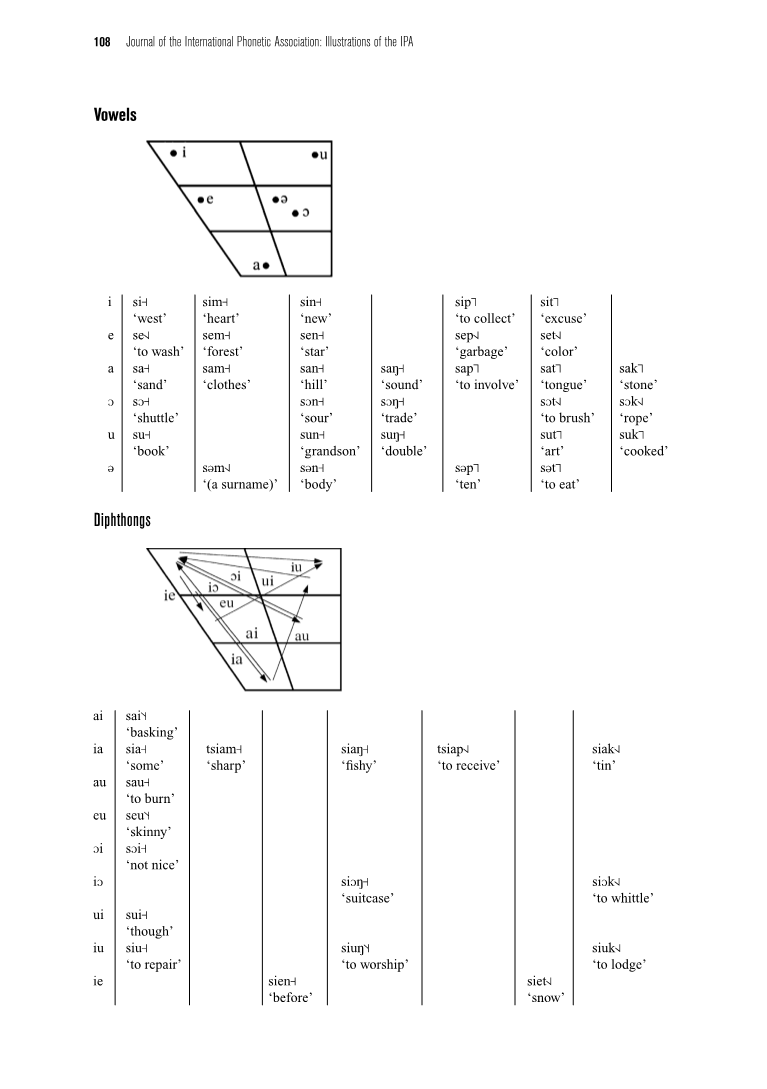 双元音[ai au ui oi eu]只出现在开放音节中;[ia iu]出现在开放和封闭音节中;[ie io]只出现在封闭音节中。在封闭音节中,[ia]出现在[p k m n]之前,[iu io]出现在[k n]之前,[ie]出现在[t n]之前。【ia】【isect;a·】【ai】【a·i】【ie】【isect;esect;】【au】【a·u 】;【eu】【esect;u】【ui】【u i】【io】【io 】;和【oi】【o i】。