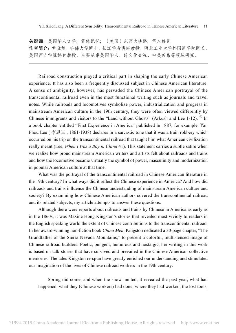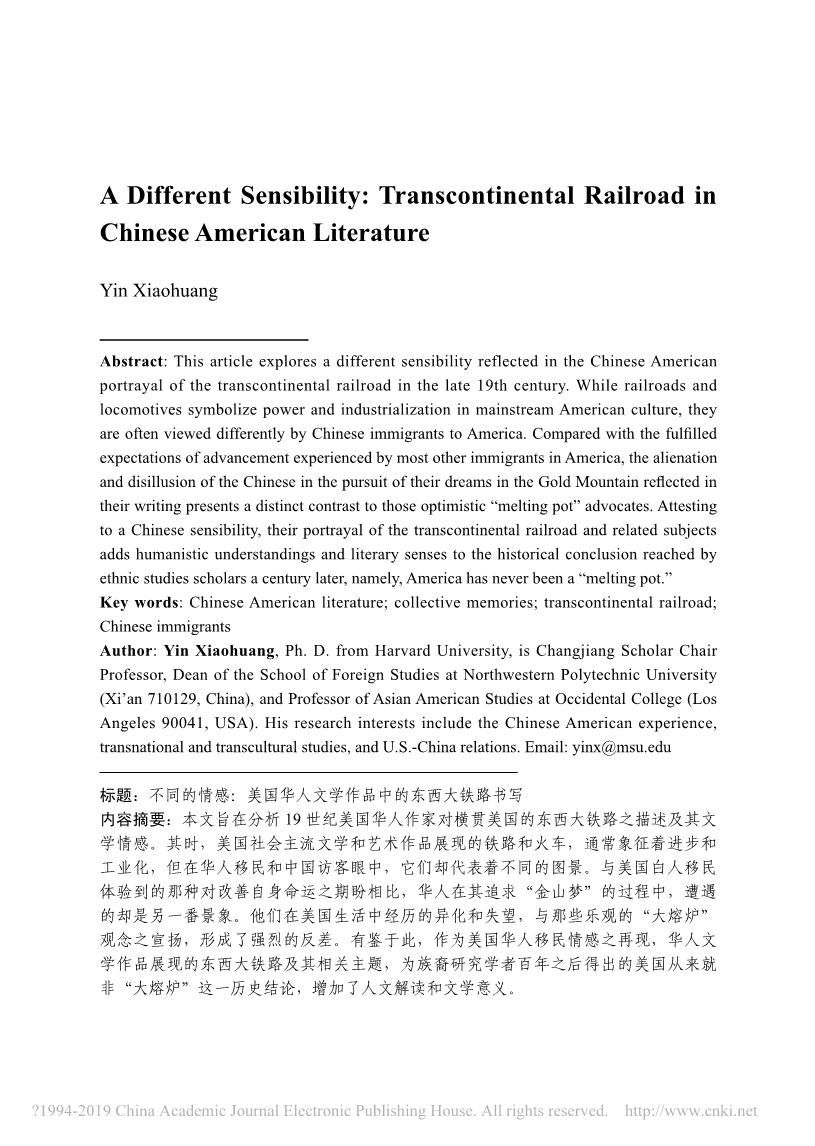 关键词:美国华人文学;集体记忆;(美国)东西大铁路;华人移民