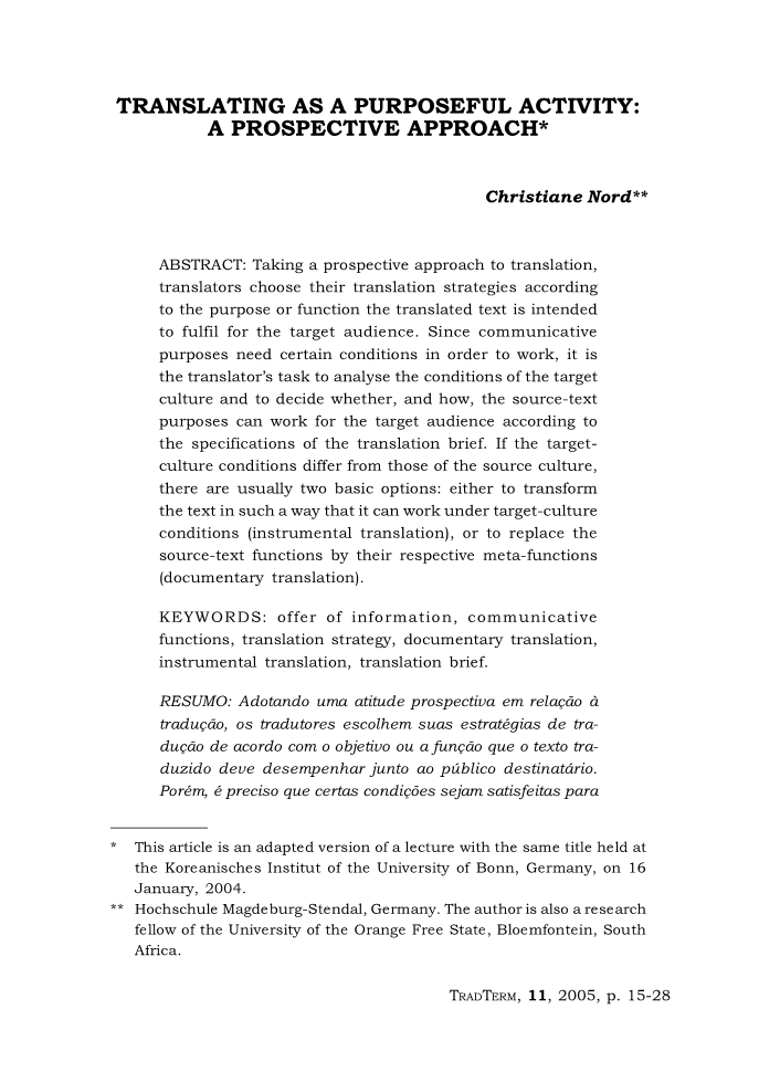 我们看到源文化和目标文化中的“功能等同”对于译者来说并不是件简单的工作。但是在大量的专业翻译任务中,“等同”并不是硬性要求甚至不作要求。申请德国大学奖学金所需材料的翻译。巴西的学校材料不会因为翻译成德语而成为德语“Abiturzeugnis”。它仍将是一份巴西的学校材料,通知德国大学管理部门(在巴西)对(巴西的)大学预科教育机构的成就进行评估。将有一个附件,译者会解释巴西的评分系统。这种翻译不会假装与原文相同,也不能用于进入巴西的任何高等教育机构。在上面的例子中翻译者必须做的两种选择告诉我们仅仅源语文本的语言转换不会导致目标文化中的功能等同,并提醒我们仔细思考几个世纪以来几个翻译理论家所建立的二分法。试想一下: