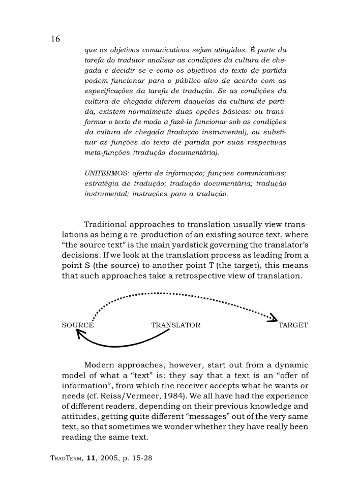 现代翻译方法起源于“文本”的动态模型:即文本是“信息的提供者”,接收者从中接受他想要或需要的东西(参见Reiss / Vermeer,1984)。我们通过对读者的一些实验得知不同的读者可以从同一文本中得到完全不同的“信息”,而这取决于他们之前掌握的知识和持有的态度,这些“信息”差异巨大,有时我们甚至会思考他们是不是真的在阅读同一篇文本。
