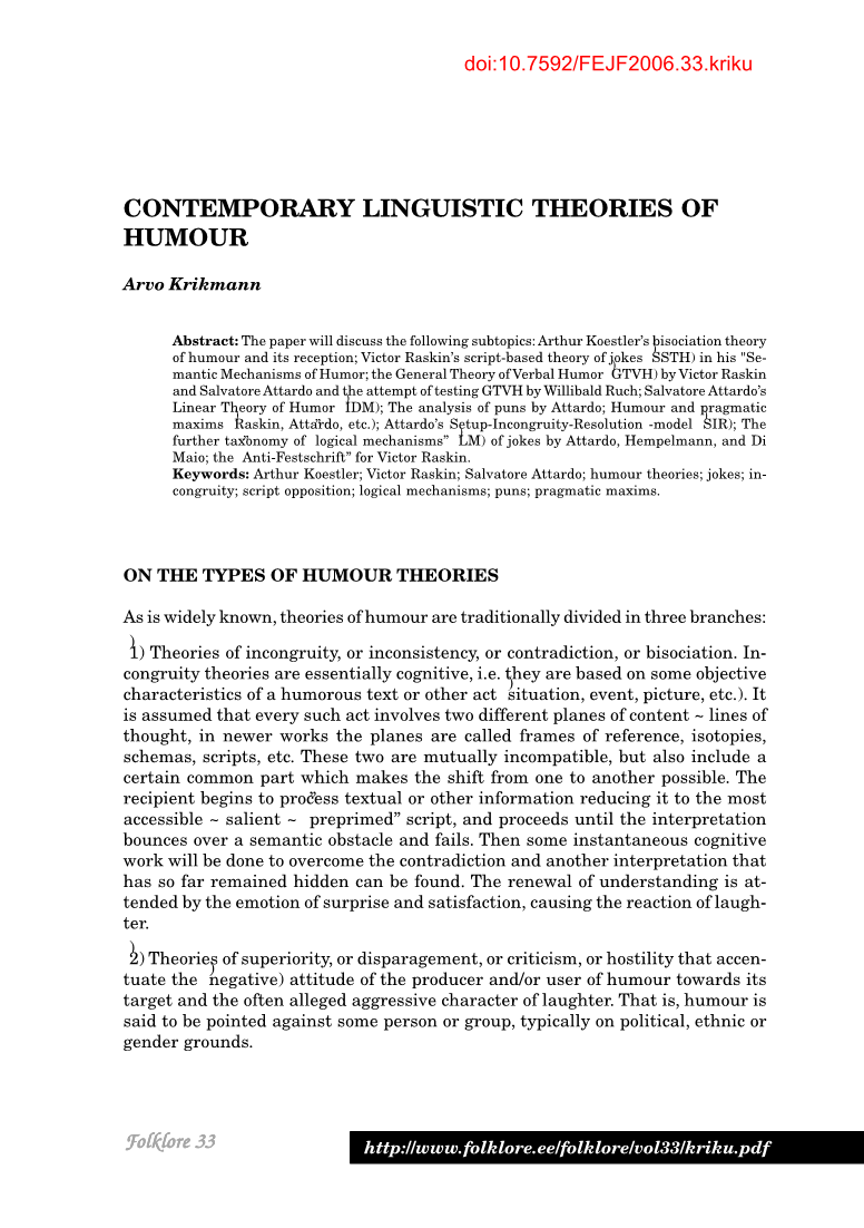 “语言学理论”是我在这里介绍的理论的一个有条件的名称。所有这些人都属于或是属于或与上述不一致的理论相辅相成,尽管他们中的一些作者更倾向于否认它。在这里,我将简要地介绍三位最杰出的人物——Arthur Koestler、Victor Raskin和Salvatore Attardo。