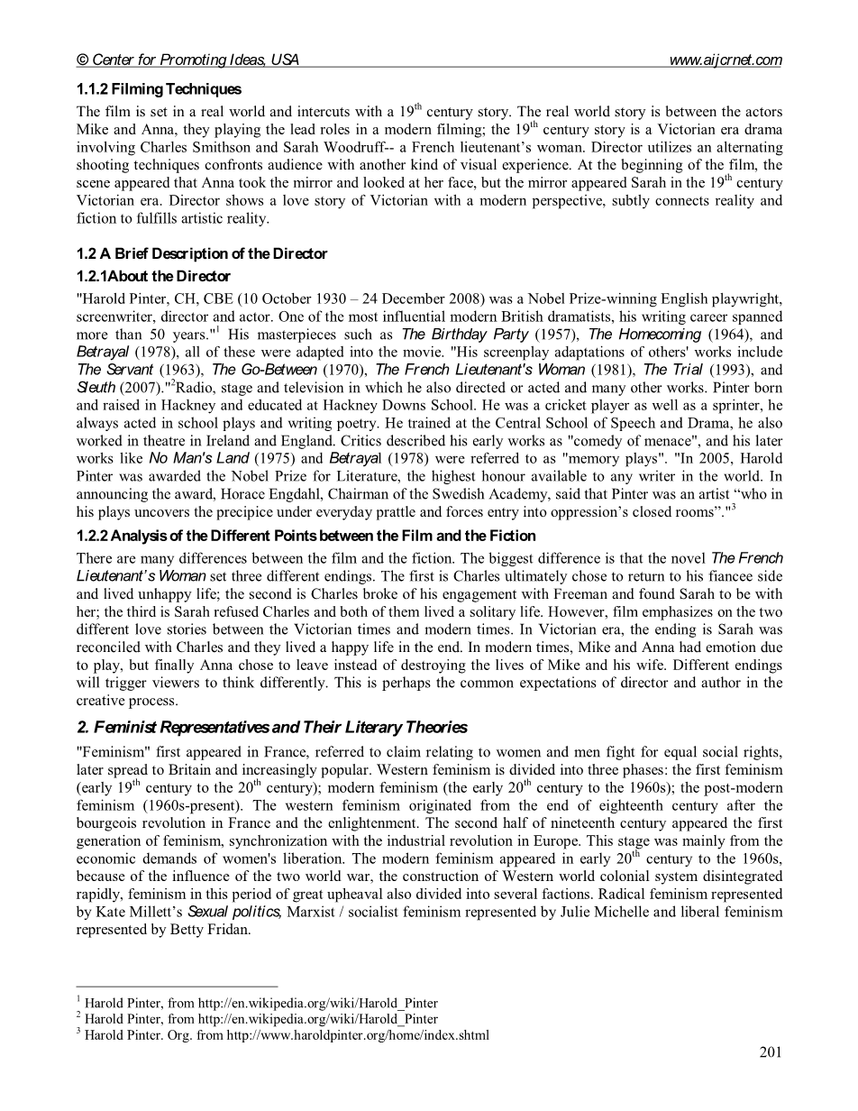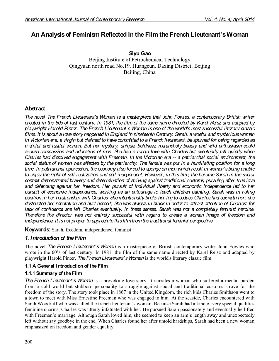 摘要:小说“法国中尉的女人”是上世纪60年代当代英国作家约翰福尔斯创作的杰作。 1981年,由卡雷尔雷斯兹执导并由剧作家哈罗德品特改编的同名电影。法国中尉的女人是世界上最成功的文学经典电影之一。这是关于十九世纪英格兰发生的爱情故事。萨拉是维多利亚时代一位悲惨而神秘的女人,一位处女但声称自己承担了法国中尉的职责,因为被视为一个罪恶和淫荡的女人而被拒绝。但她的神秘,独特,大胆,忧郁的美丽和疯狂的热情会激起人们的同情和崇拜。她对查尔斯产生了热烈的喜爱,但当查尔斯解散了与弗里曼的交往后,她最终平静地离开了。在维多利亚时代 - 父权社会环境下,妇女的社会地位受到父权制的影响。这位女性长期处于屈辱的地位。在父权制的压迫下,经济也迫使男人受到鼓励,致使妇女无法享有自我实现和自主独立的权利。然而,在这部影片中,女主角萨拉在社会上表现出了对传统习俗的追求的勇敢和决心,追求真爱和捍卫自由。她对个人自由和经济独立的追求导致她追求经济独立,作为教导儿童绘画的随行人员。莎拉在与查尔斯的关系中处于统治地位。她故意摔断腿诱惑查尔斯与她发生性关系;她破坏了她的声誉并伤害了自己;为了吸引查尔斯的注意,她总是黑色的;由于缺乏自信,她最终离开了查尔斯。在这些意义上,莎拉并不是一个完全的女权主义女主角。因此,导演在创造女性形象的自由和独立方面并不完全成功。从传统的女权主义角度去欣赏这部电影是不合适的。