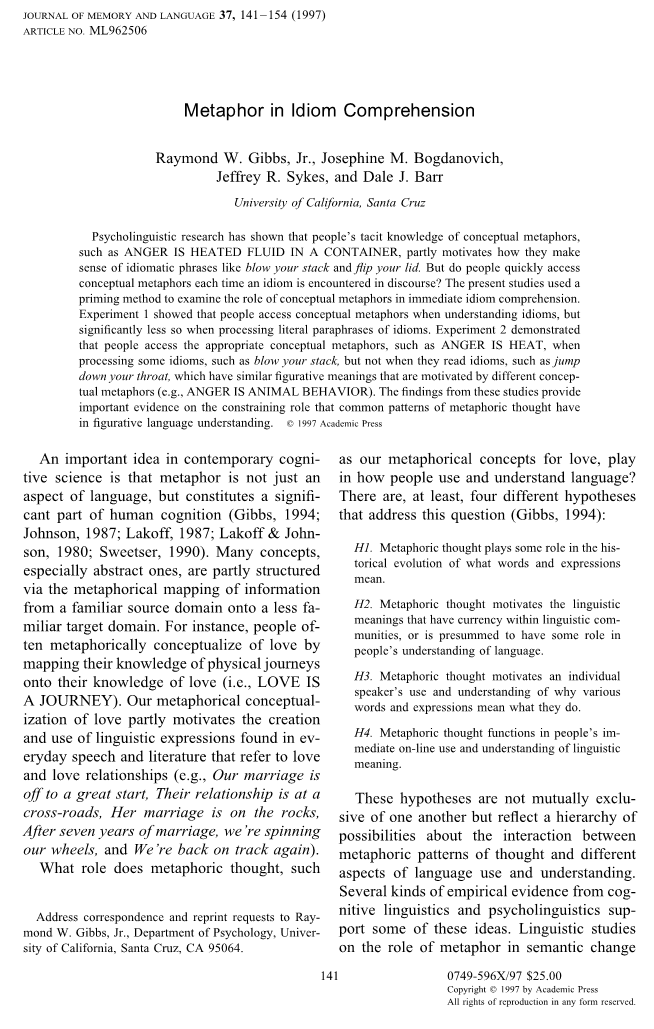 心理学研究表明人们对概念隐喻的隐性认识就像ANGER IS HEATED FLUID IN A CONTAINER. 在一定程度上促使他们知道如何理解惯用语,比如:blow your stack and flip your lid.但是人们会在每次谈话中都有习语并快速使用概念隐喻吗?本研究采用启动测量方法来检测概念隐喻在直接习语理解中所起的作用。实验1表明,人们会在理解习语时使用概念隐喻,但在处理习语的文字释义时的使用会明显减少。实验2表明,人们接触相应的概念隐喻,如:ANGER IS HEAT, 当处理一些习语时,比如:blow your stack, 而不是当他们读习语时,比如:jump down your throat, 这些相似的比喻意义由不同的概念隐喻产生动机(例如:ANGER IS ANIMAL BEHAVIOR)。这些研究结果为具有约束作用且常见的有修辞语言理解的隐喻思维模式提供了重要根据。