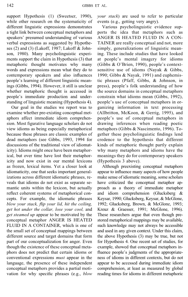 各种心理语言学证据可以支持这种隐喻观点,比如:ANGER IS HEATED FLUID IN A CONTAINER.这句话是真正的概念,简单地说,而不是语言意义的概括。这包括已经观察过人们心理意象习语的研究(Gibbs amp; Orsquo;Brien, 1990),人们对上下文相关习语(Nayak amp; GIBBS,1990; Gibbs amp; Nayak,1991)和委婉词语的使用(Pfaff, Gibbs, amp; Johnson, in press),人们对概念隐喻中怎样限制源领域习语所表达意义的民间理解(Gibbs,1992),人们在文本处理时是怎样组织信息并使用概念隐喻的(Allbritton, McKoon, amp; Gerrig,1995),人们在读诗意隐喻时对概念隐喻的举一反三(Gibbs amp; Nascimento,1996)。综合这些心理语言学研究结果可以使人们相信,不同种类的隐喻思维在一定程度上可以解释为什么许多比喻和习语有它们当代的意义(上述假设3)。